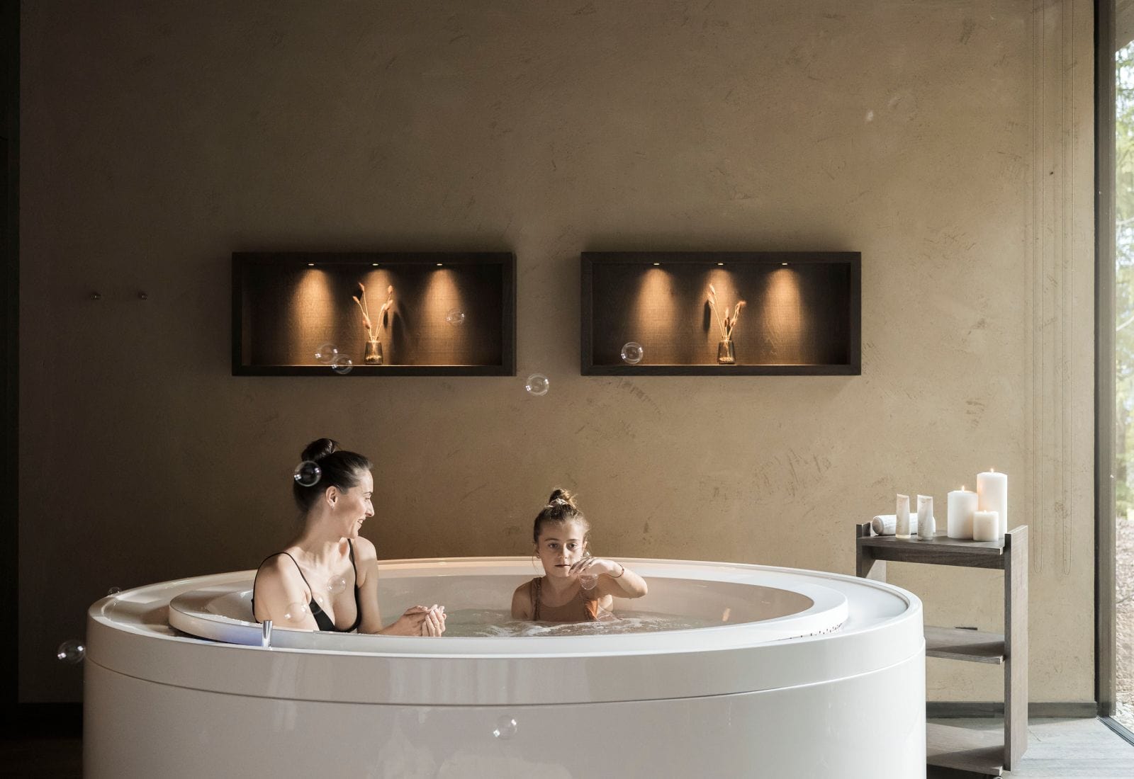 Sie möchten in den Ferien gerne Momente purer Wellness mit der ganzen Familie genießen? Dann sind Spa und Poolbereich das Richtige für Sie! Die Wasserwelt wurde vor allem für Kinder entworfen, mit einem Infinity-Pool im Freien und einem Indoor-Pool, beide 36°C warm, um sich mit Sprüngen und Wasserspielen zu vergnügen oder auf den Rutschen Zeitrennen zu veranstalten. Denn davon gibt es gleich drei: Speed-Wasserrutsche, Erlebnis-Reifenrutsche und Wellenrutsche. Dann geht es ab in die Family-Textilsauna, um sich danach im Eisbrunnen abzukühlen oder mit einem Märchenbuch auf den Familienliegen zu entspannen.