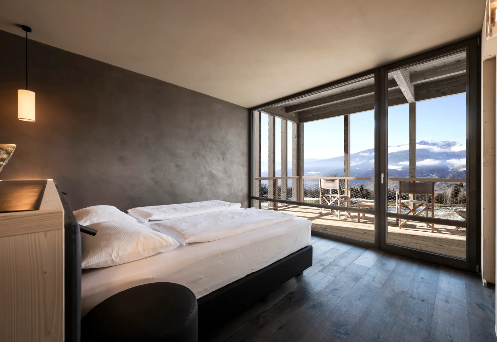 Family Home | Family HomeSize:70 m² People:4–7 Facility:3 separate bedrooms / 2 bathrooms View:Mountains and forest One double bedroom and two separate children’s rooms, one of which can also be transformed into a double by joining the two single beds. The Family Homes have a 10-metre panoramic terrace, a raised living room with play corner, a wardrobe space with hanging bars at different heights (also suitable for children), 2 bathrooms with shower, one of which has a separate WC and bidet, change table, children’s washbasin, along with ADLER Spa Cosmetica Attiva toiletries and bathrobes for the whole family. In the Family Home, you will also find a microwave, kettle station and a selection of tea and coffee, as well as a night light. |