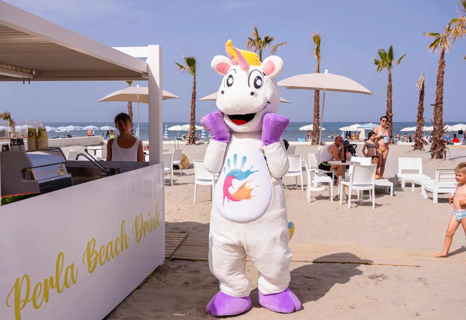 Here at Color Perla Village, we like to pamper our guests. You will find us in Bellaria-Igea Marina right in front of our private beach, a true oasis of leisure and entertainment covering 10,000 square metres, divided into 3 distinct areas. There’s the multi-sport arena with beach-volleyball, bowls and teqball courts plus a stage for evening entertainment. We then have the lounge area with palm trees and comfortable sun loungers along with the bar area where the Food Corner is located. Four-legged friends are also welcome in the fenced pet area.