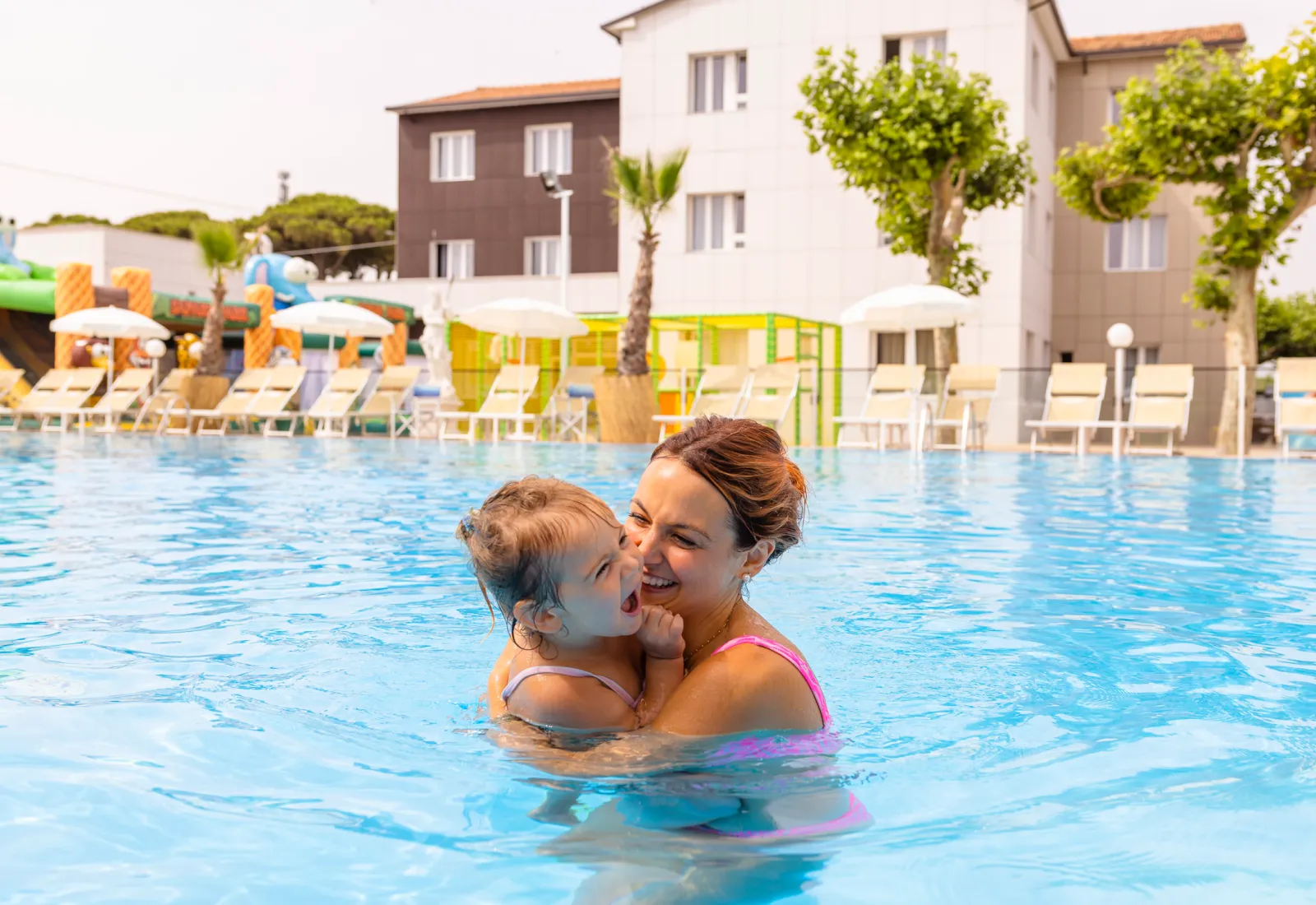 | 1Private beachIn front of the hotel, spanning 10,000 m2 and divided into 3 separate areas, with a fenced area for pets. | 2Semi-Olympic poolIt is 25 metres long, with a children's pool, a super waterslide splash, a hot tub and a sunbathing area. | 3Premium All InclusiveUnlimited open bar, daily entertainment, free parking, Food Corner, Coco Snacks and Buonanotte Coco. |