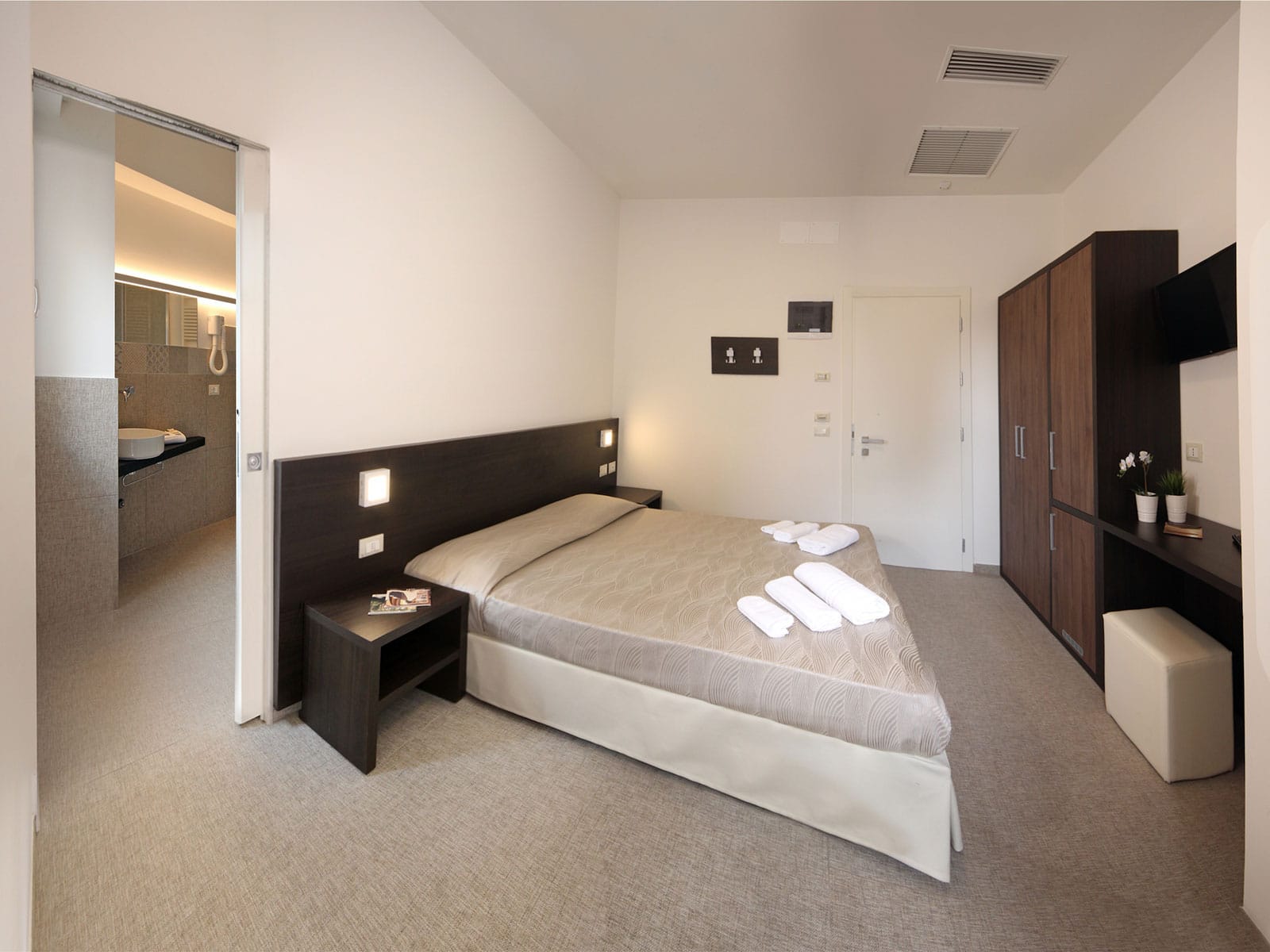 Family Small Serafino | Family Small SerafinoSize:25 sq.m Capacity:5 people Spaces:2 rooms The Family Small Serafino consists of two communicating rooms: a double bedroom and a bedroom with a bunk bed and a single bed (the bunk bed can be closed and thus have two single beds), with a completely renovated bathroom. The two rooms are themed by our mascot Serafino to recreate a truly magical world for children! Among the comforts of these rooms there are 2 balconies, air conditioning in both rooms with automatic adjustment, 2 LED 32 “TVs, a safe, a mini-fridge, free Wi-Fi and a bathroom with hairdryer, shower cubicle and courtesy service. |