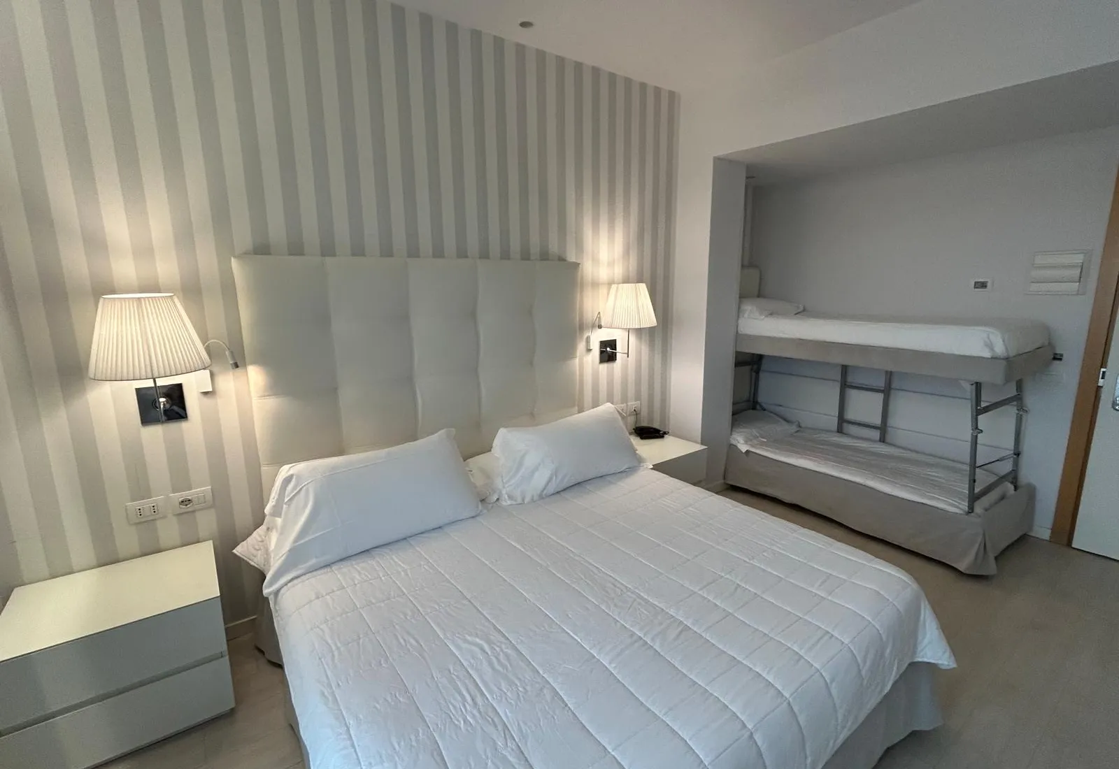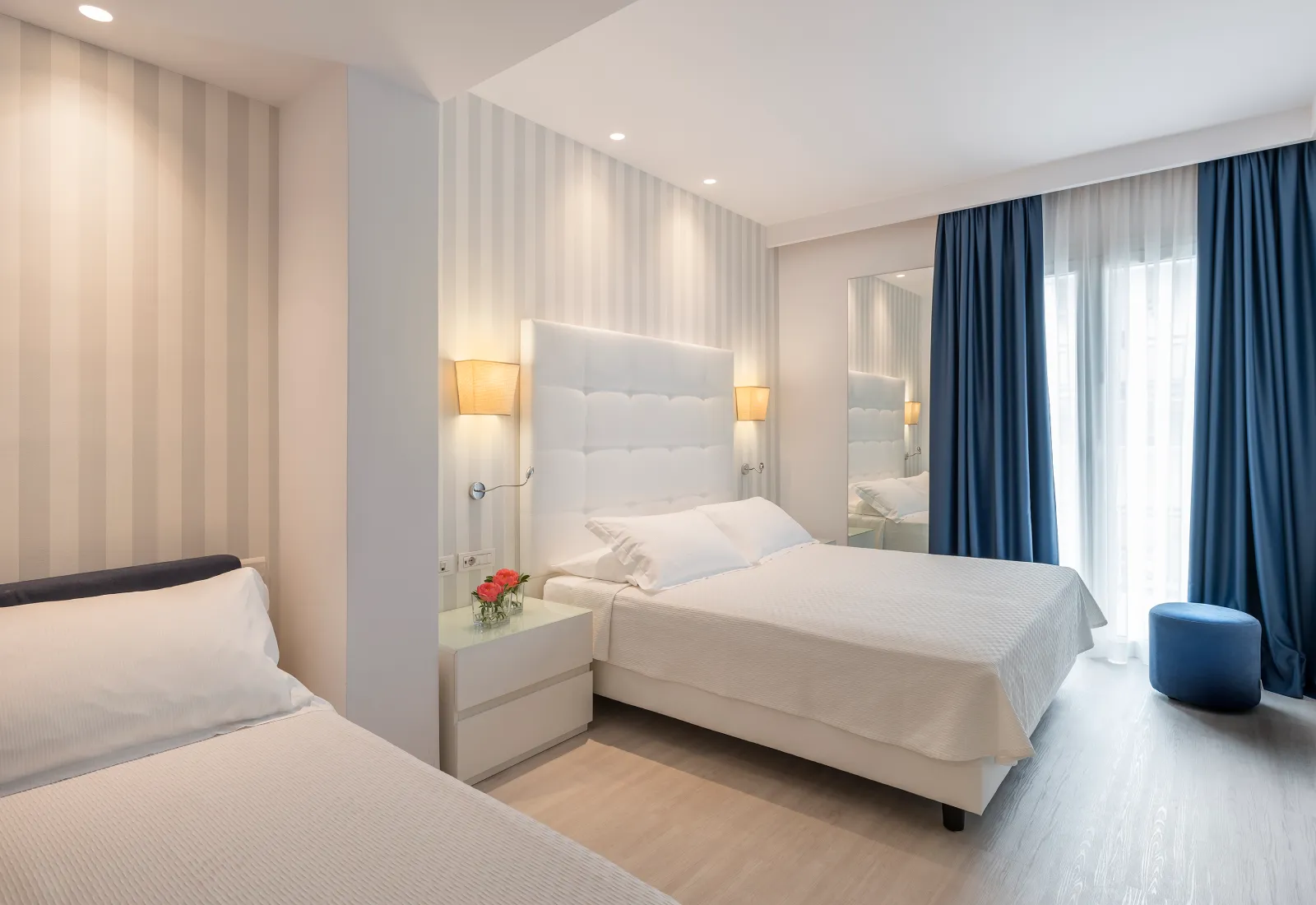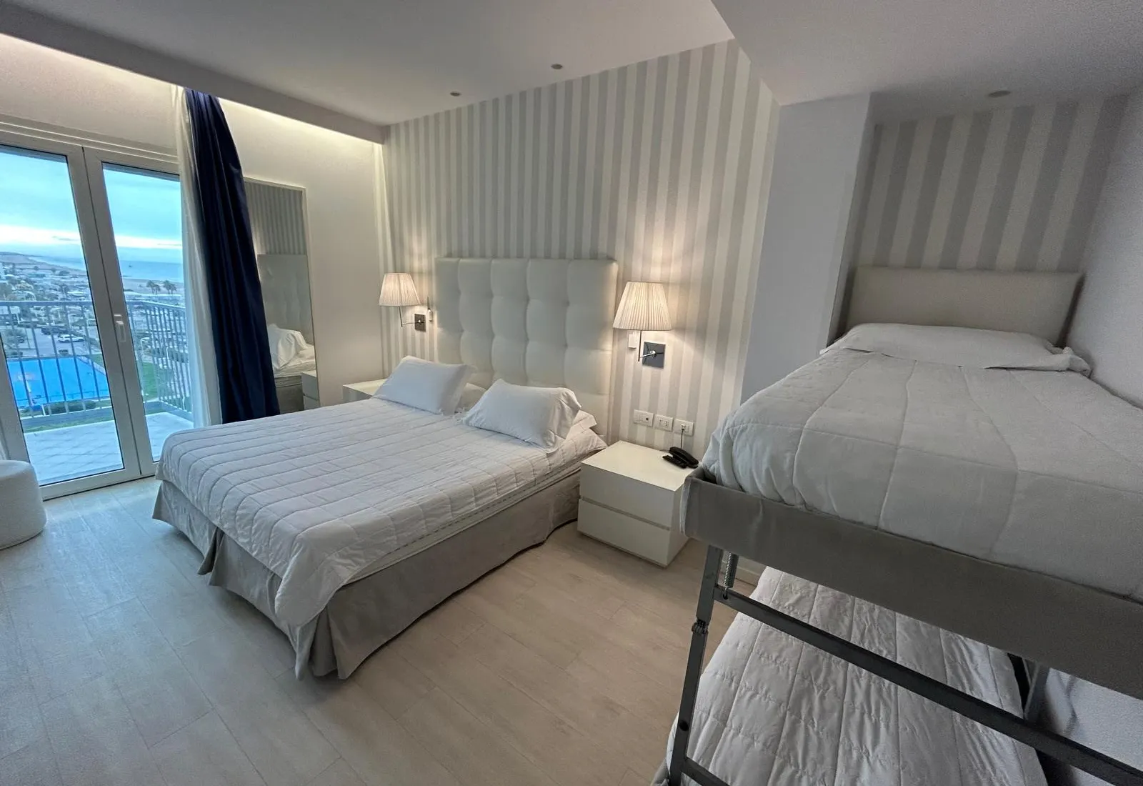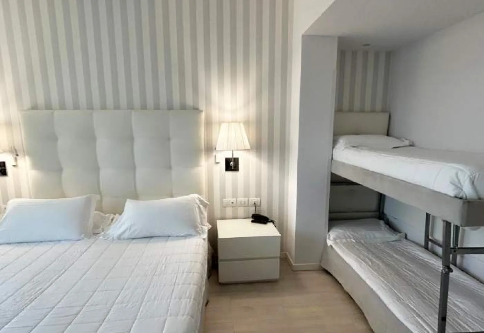 Sea Front SuiteSize:30 sq.m Capacity:6 people Spaces:2 rooms The Family Rooms Facing the Sea are approximately 20 square meters in size, completely renovated, with a modern and elegant design, consisting of a double bedroom and an adjoining bedroom with booth, with a large, new private bathroom, and three balconies, two of which overlook right in front of the sea. | Sea Front Suite |