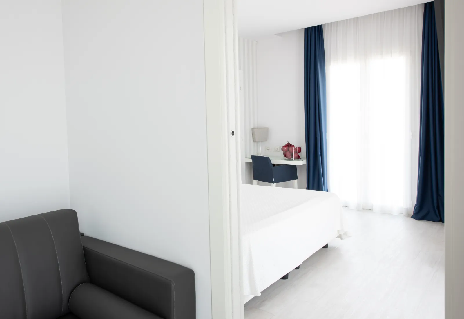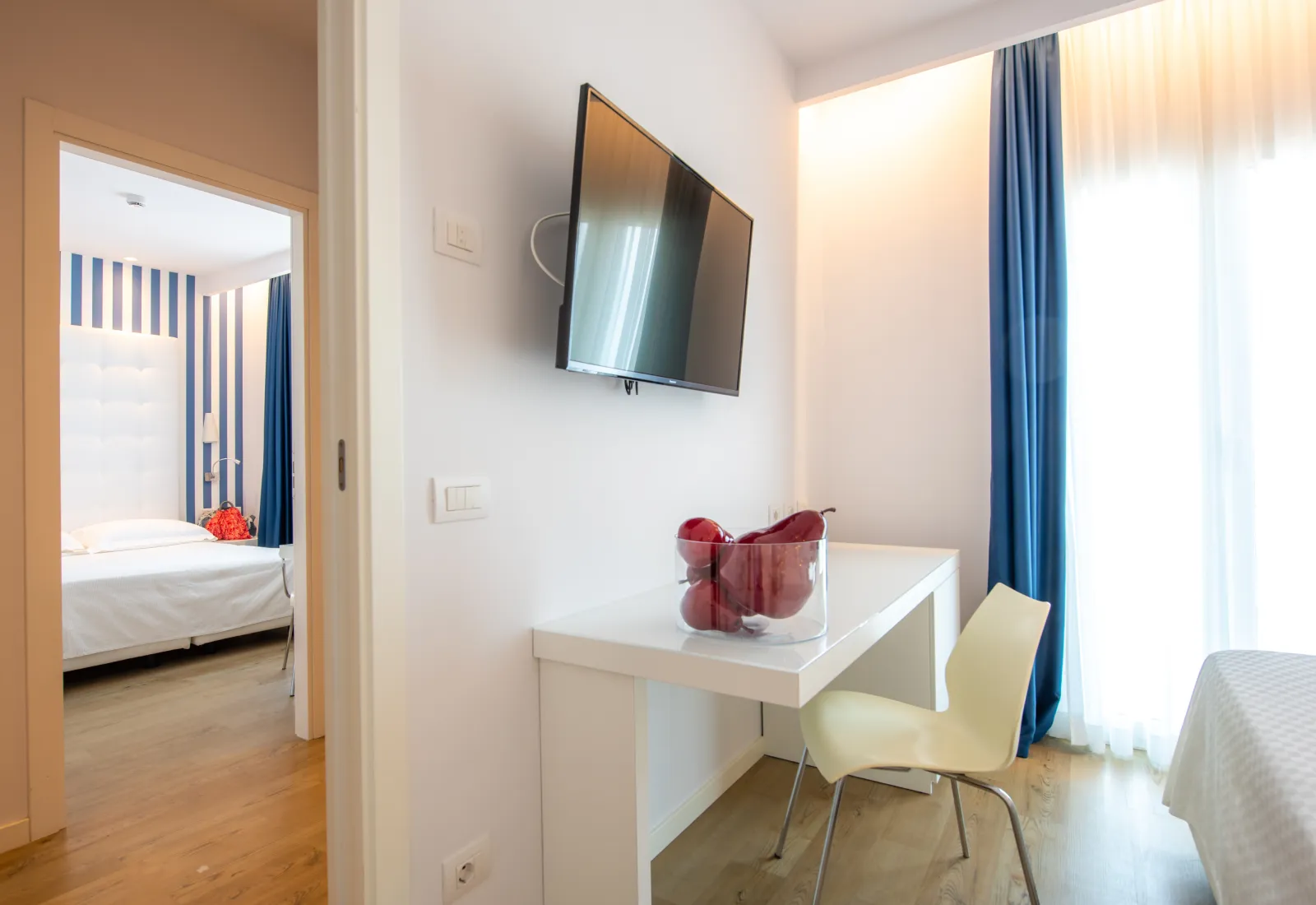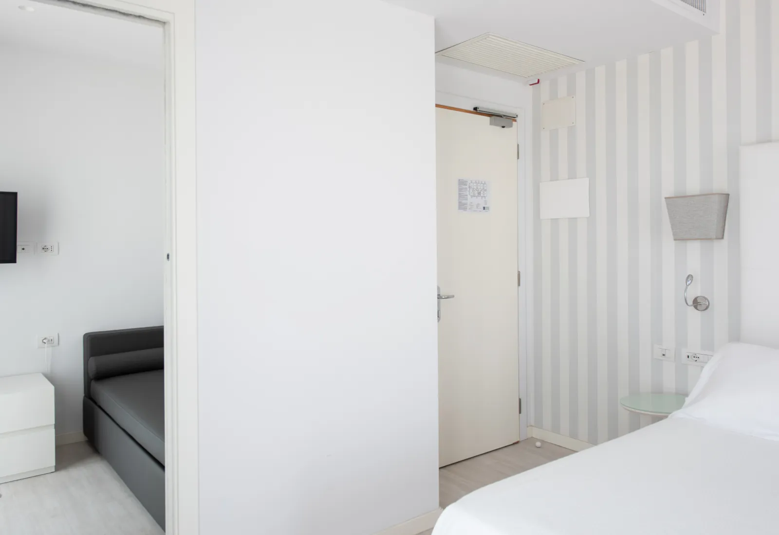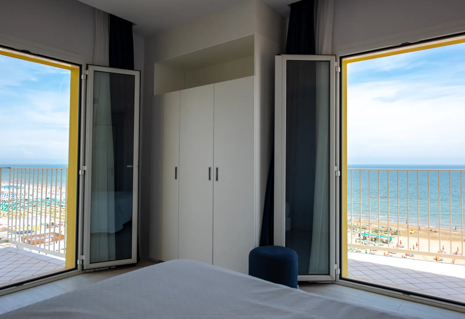 Sea Front SuiteSize:30 sq.m Capacity:6 people Spaces:2 rooms The Family Rooms Facing the Sea are approximately 20 square meters in size, completely renovated, with a modern and elegant design, consisting of a double bedroom and an adjoining bedroom with booth, with a large, new private bathroom, and three balconies, two of which overlook right in front of the sea. | Sea Front Suite |