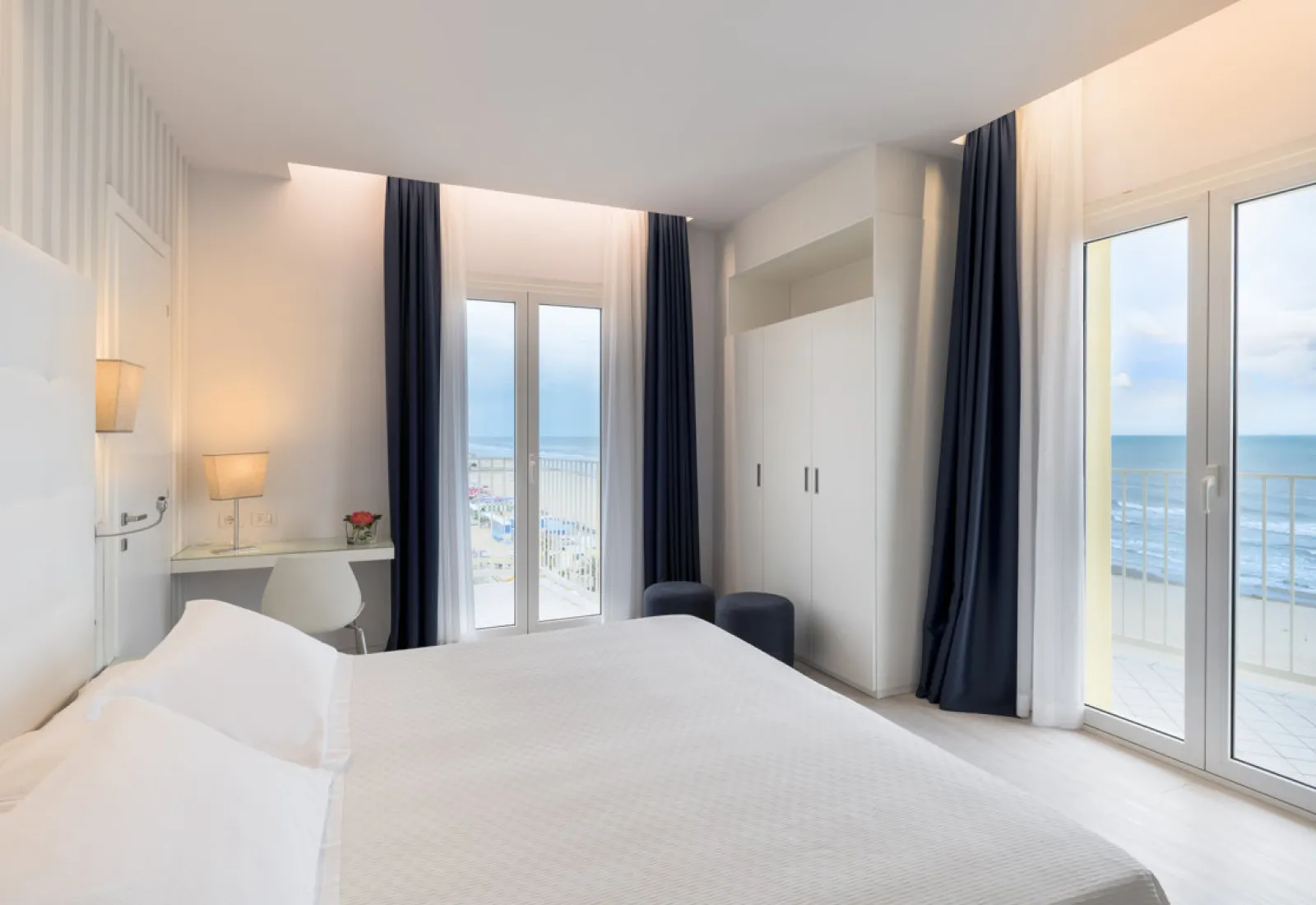 Ocean Rooms | Ocean RoomsSize:18 m2 View:sea Completely soundproofed and furnished with an elegant and modern design, these spacious rooms include LCD TVs with Mediaset Premium service, direct dial telephones, independent air conditioning/heating, safes, minibars, and balconies overlooking the sea. |