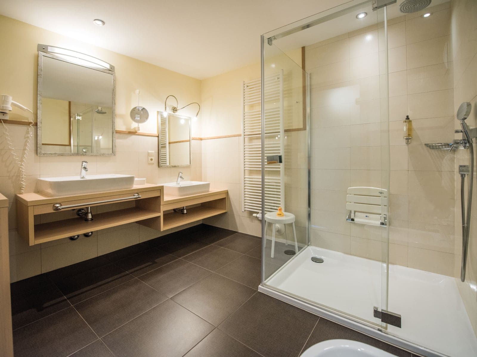 The Akelei SuiteSize:35 m2 People:2 adults, 1- 3 children This family Suite includes a separate children’s room with a bunk bed. The cosy and elegant environment features natural wood furnishings and flooring, a telephone with a built-in baby monitor, a bathroom with an experience shower, washbasins for adults and children, and bathrobes. | The Akelei Suite |