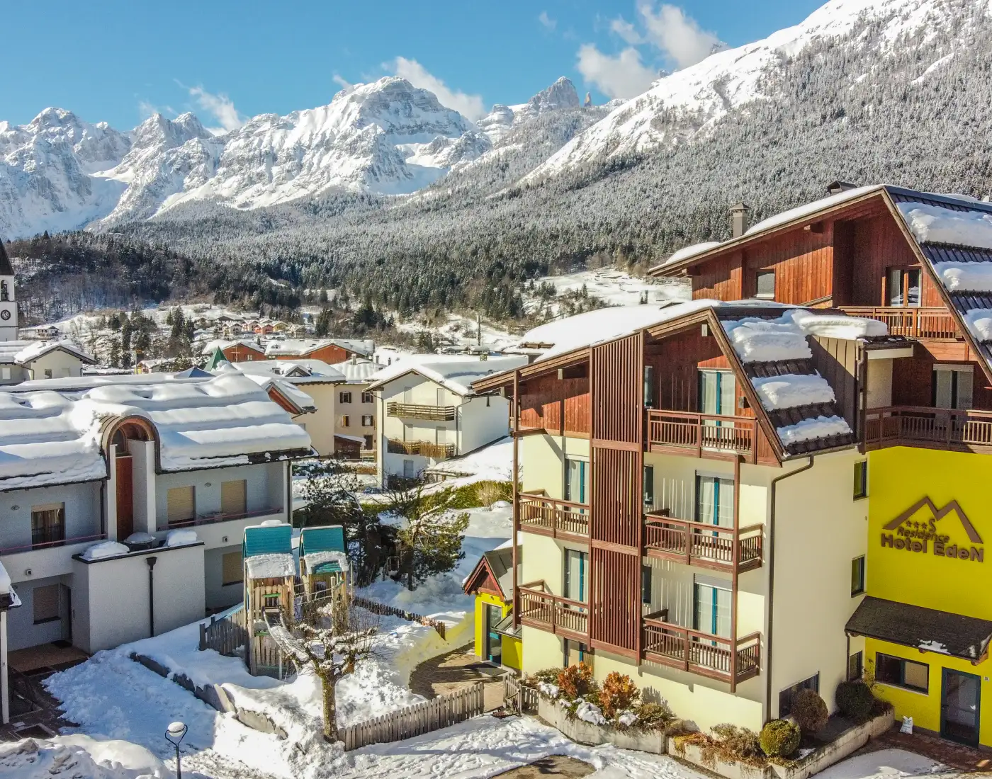 Trips to the mountain lodge with the snowcat, snowshoeing excursions, polenta meals at the foot of Castel Belfort, excursions to learn more about the bears and the bees, tours of the educational farm, and trips to the wellness Spa, all amid the wonderful landscapes of the Adamello Brenta Park and the Paganella Ski area… the holiday experience here at the Residence Hotel Eden – Family & Wellness Resort consists of lots of fantastic experiences and relaxation, making it ideal for every family!