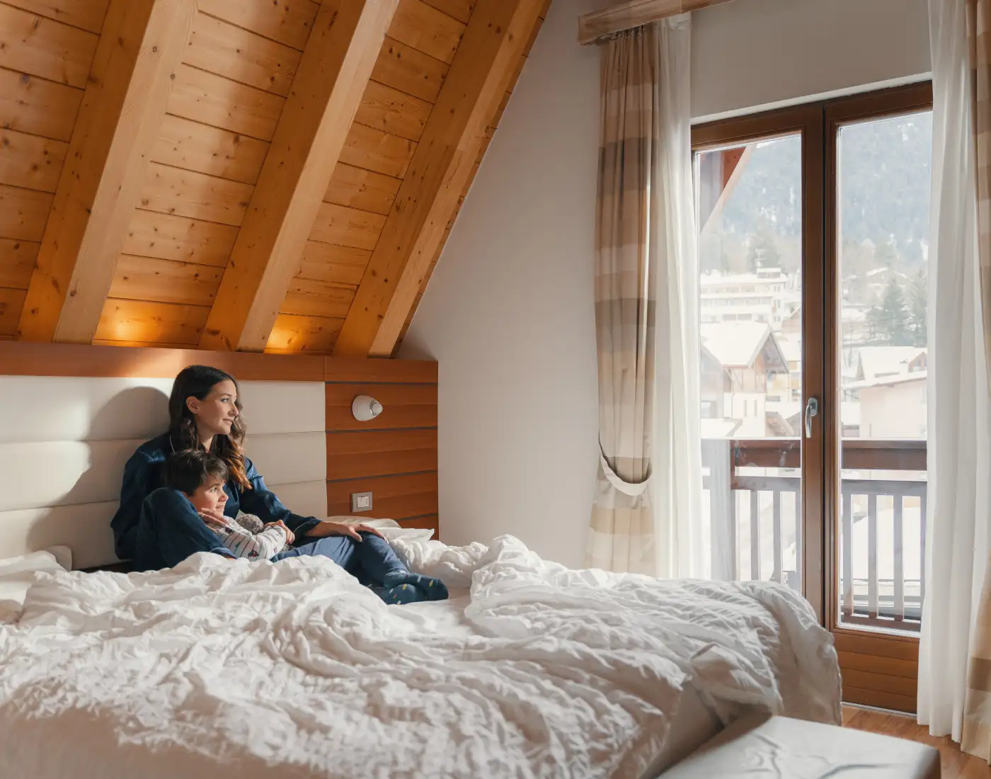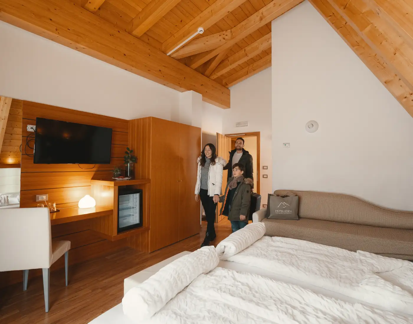 Junior Bio, Junior Dolomiti, Junior Paganella | Junior Bio, Junior Dolomiti, Junior PaganellaSize:20/25 mq People:3/4 View:Dolomites Functional accommodation furnished in solid wood with parquet flooring, queen-size bed, sofa bed that sleeps two children, a safe, mini-fridge, balcony and views of the Brenta Dolomites. |