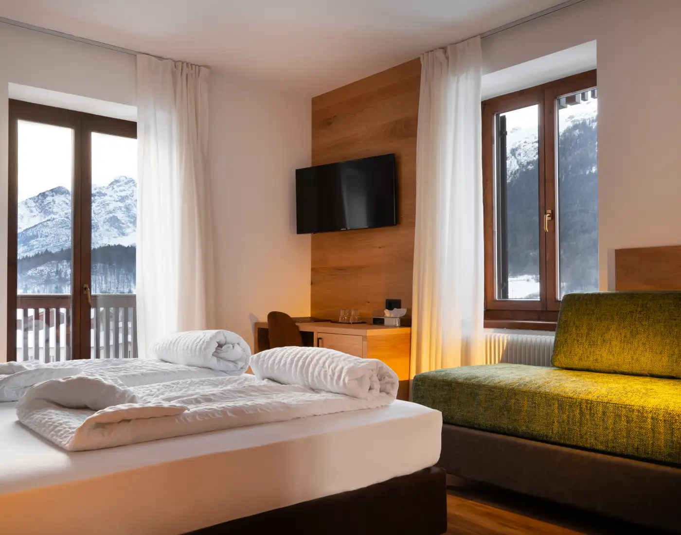 Family Suite, Gran SuiteSize:42 mq People:5 View:Mountains Spacious Suites suitable for large families with two inter-connecting rooms or spaces that can be divided. Rooms furnished in a modern Alpine style with parquet flooring, a safe, mini-fridge, balcony and mountain views. | Family Suite, Gran Suite |