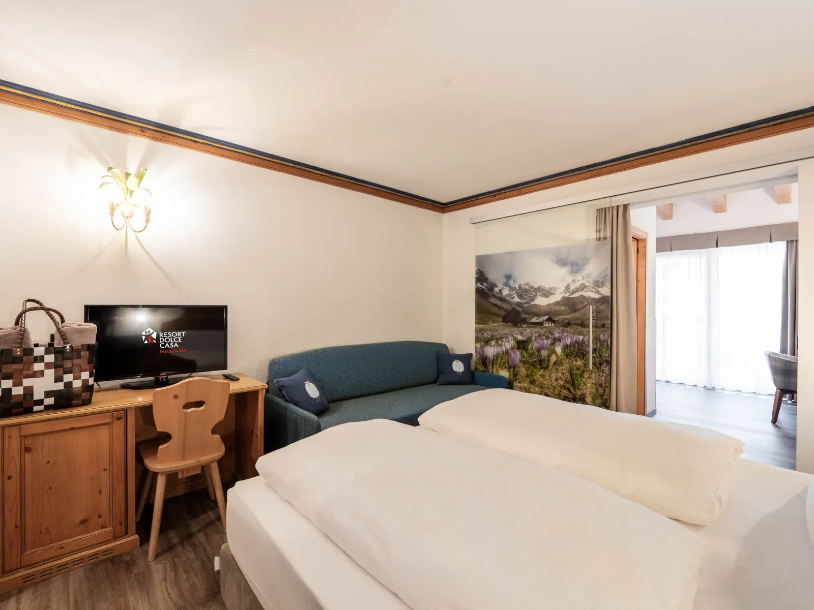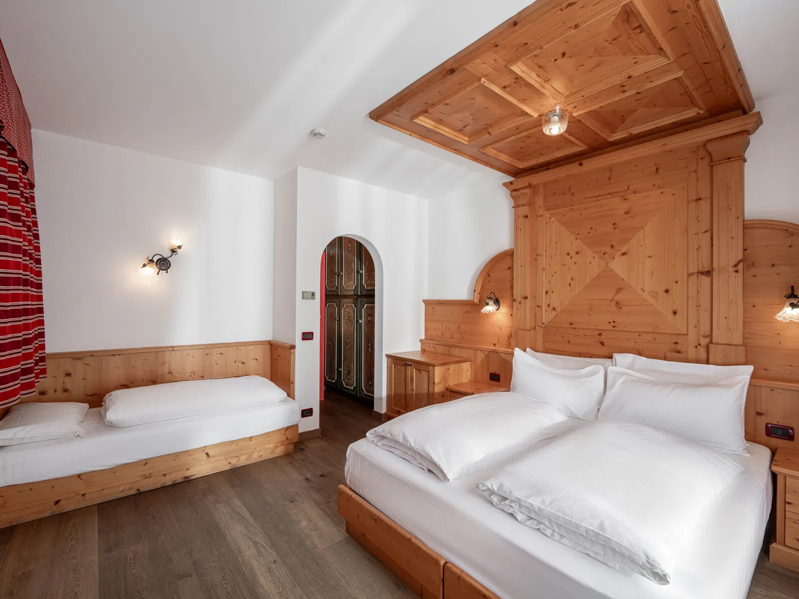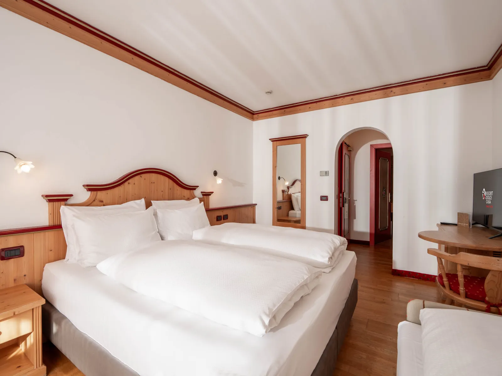 The Dolce Casa Suite | The Dolce Casa SuiteSize:65 m2 This suite was created by combining a Classic room and a Dolomiti Family Suite, which are linked by an entrance corridor, and is perfect for larger families. It consists of 3 bathrooms, a panoramic balcony, and a smaller balcony, and can accommodate up to 6 adults, with the possibility of adding 2 camping cots for children. |