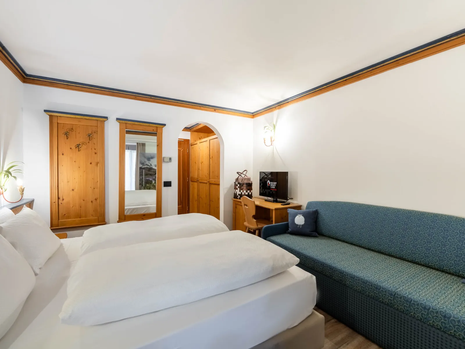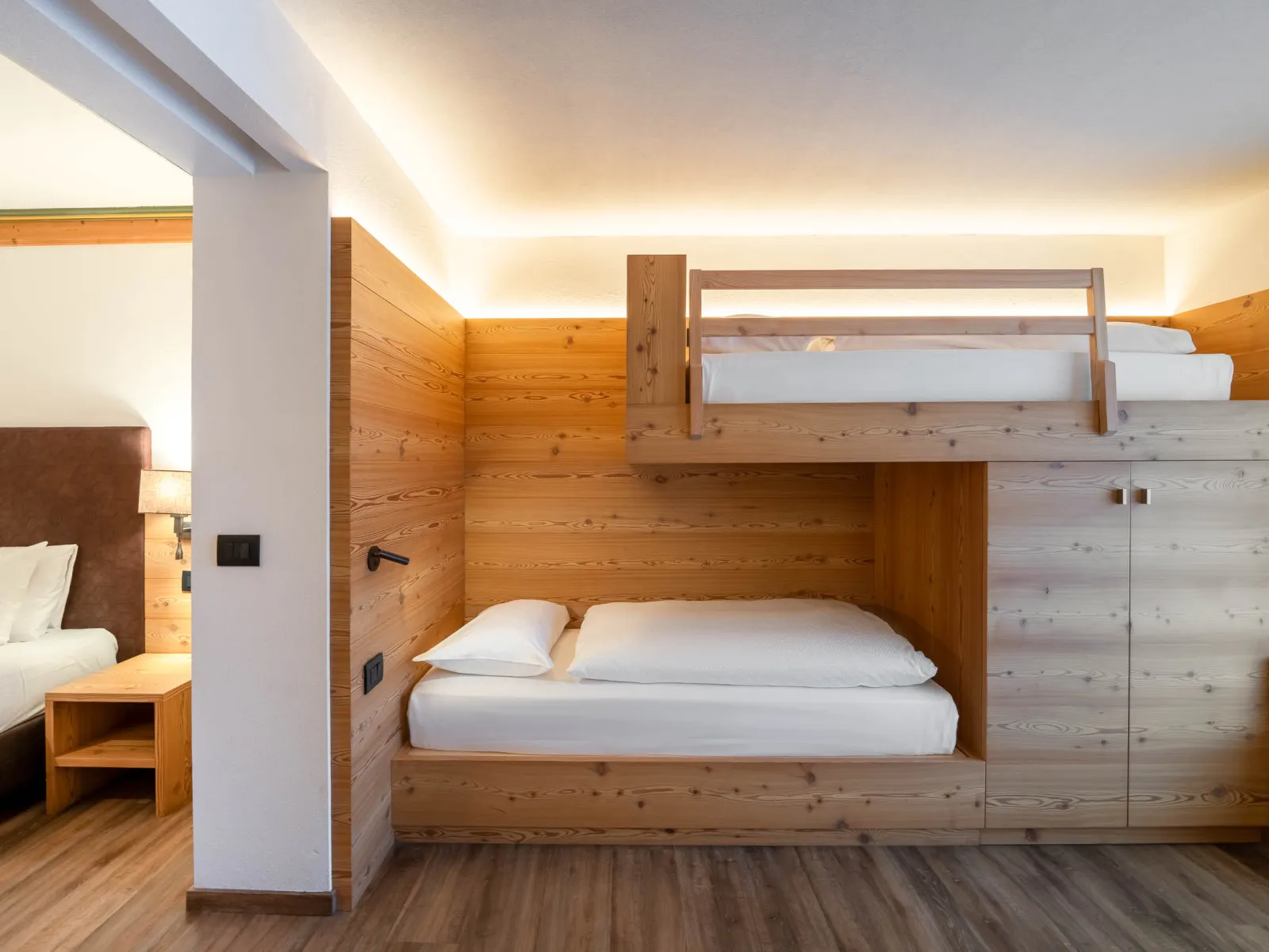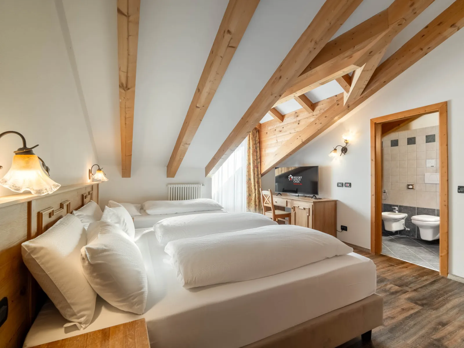 The Dolce Casa Suite | The Dolce Casa SuiteSize:65 m2 This suite was created by combining a Classic room and a Dolomiti Family Suite, which are linked by an entrance corridor, and is perfect for larger families. It consists of 3 bathrooms, a panoramic balcony, and a smaller balcony, and can accommodate up to 6 adults, with the possibility of adding 2 camping cots for children. |