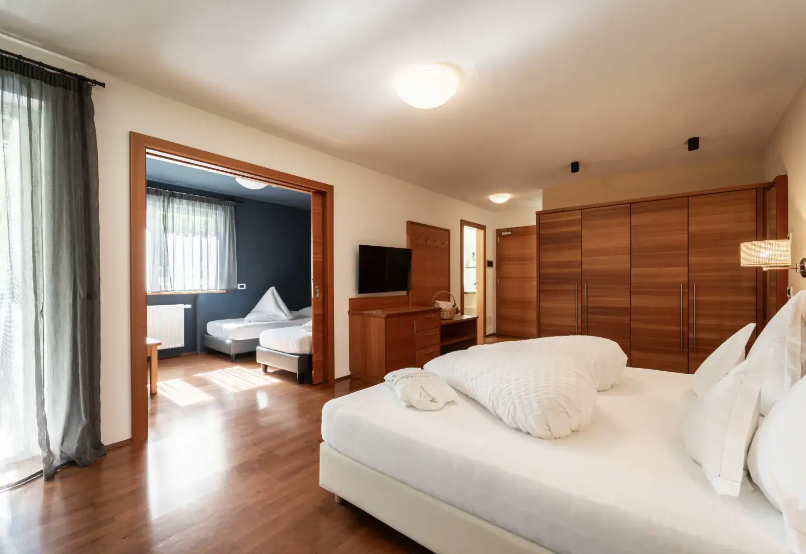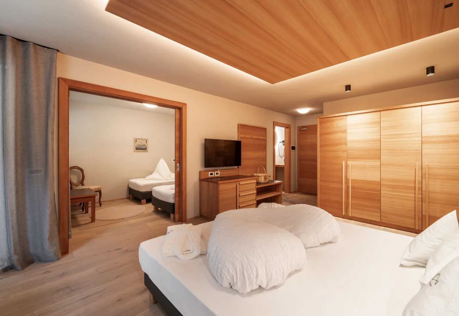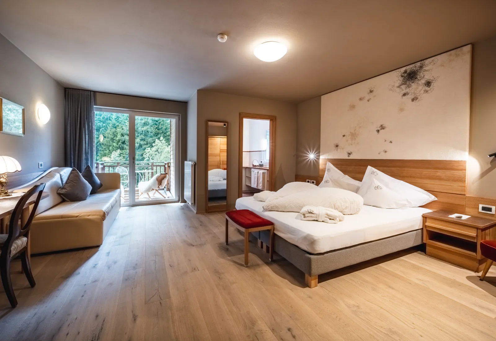 Suite Famiglia Bad RatzesStruttura:Comunicante Persone:2 adulti+2 bambini+1 bebè Dimensione:42 mq Camera di 42 mq con balcone, pensata per 2 adulti, 2 bambini e un neonato. Dispone di un bagno con fasciatoio e tanto spazio per gli accessori dei piccoli e momenti di relax. | Suite Famiglia Bad Ratzes |