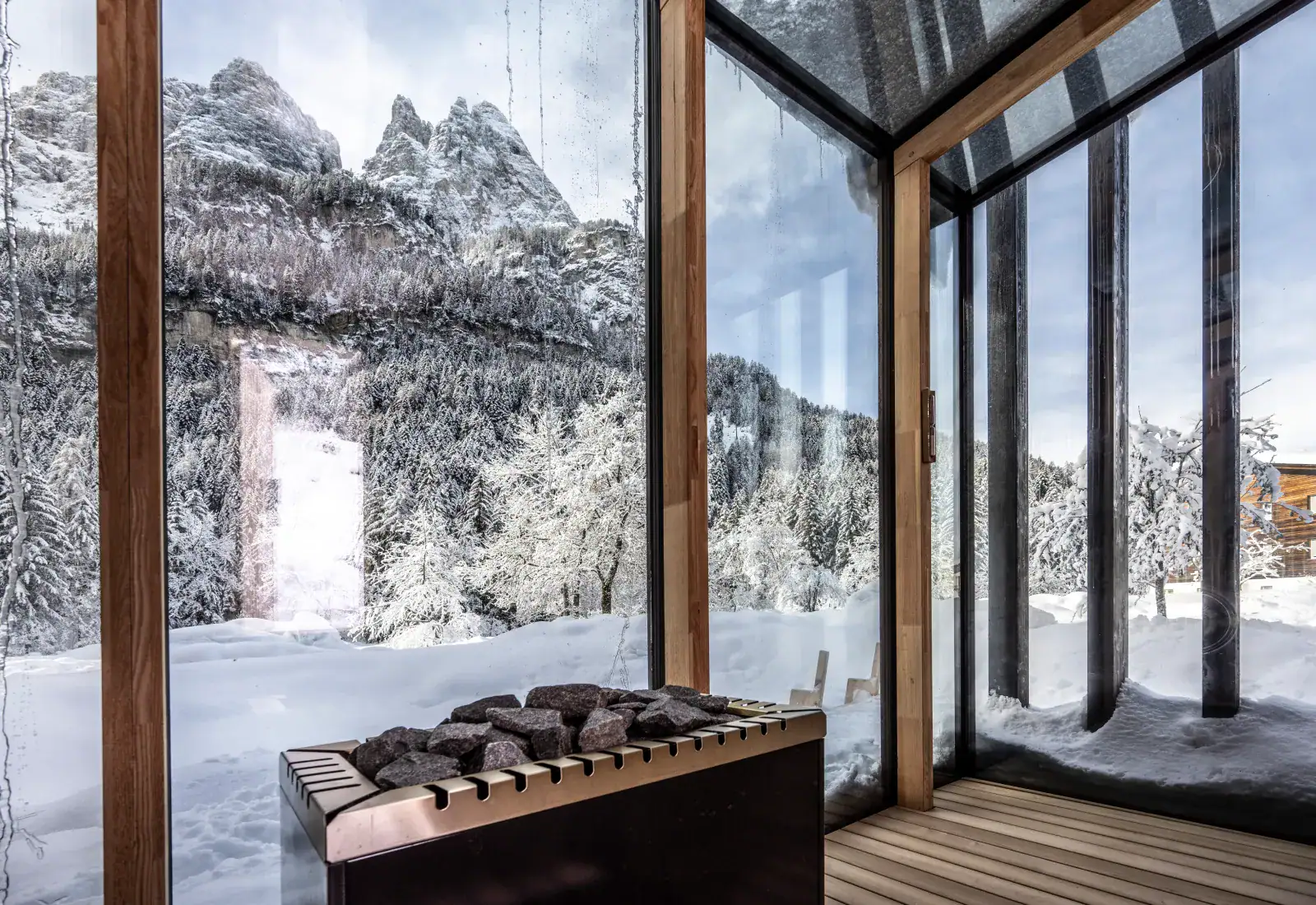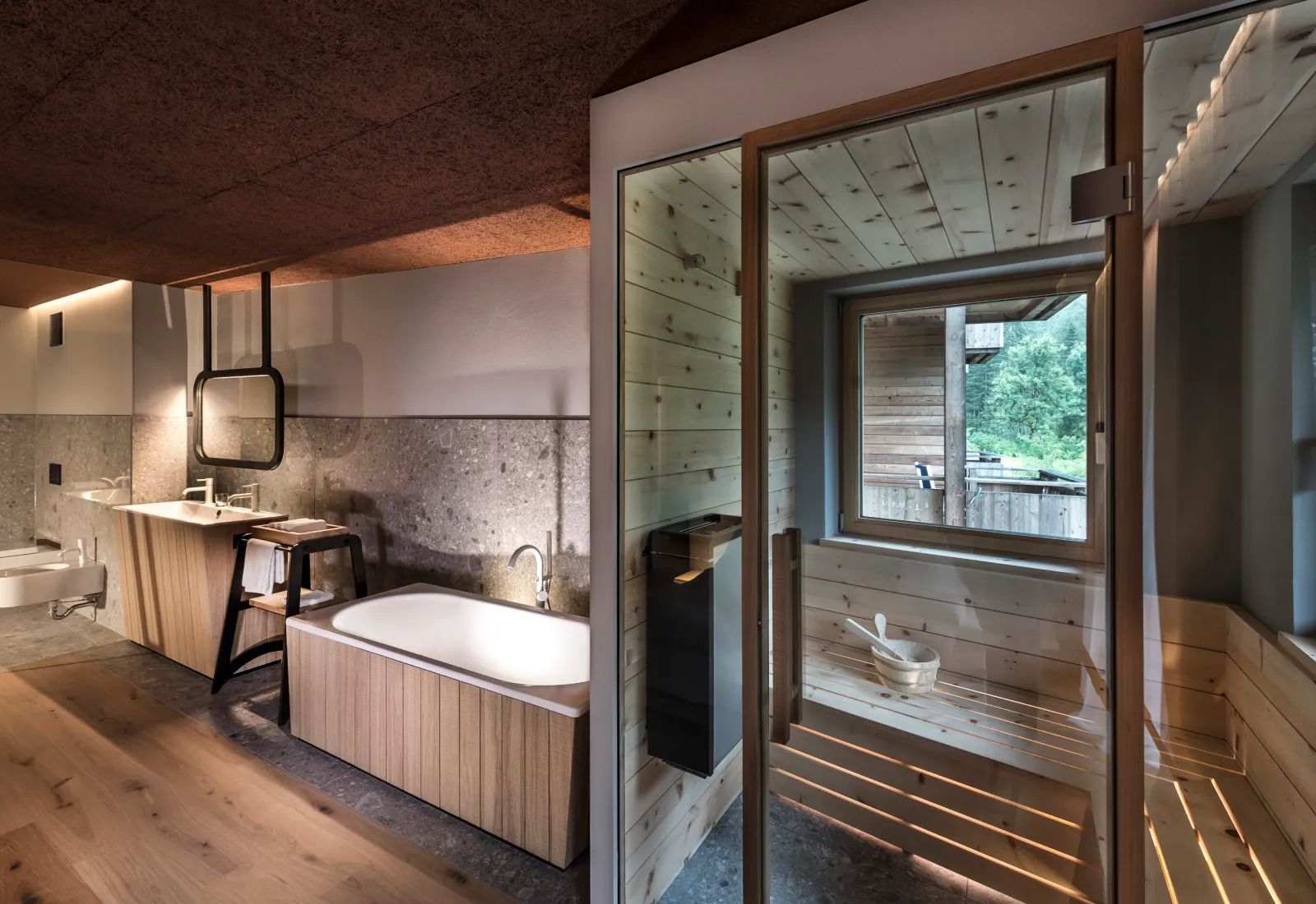 Suite Köpf | Suite KöpfDimensione:47 mq Capienza:4 persone Ambienti:1 stanza Suite di nuova concezione: spaziosa, luminosa, sapientemente arredate per un comfort di primo livello. Spazio notte elegantamente integrato nell’ambiente. Spazio giorno con ampio divano relax. Sauna finlandese con vista sullo Sciliar. Vasca da bagno, doccia spaziosa e WC separato. Suddivisione con ampie vetrate per integrare in modo armonico il living con la zona bagno. Balcone con splendida vista sul massiccio dello Sciliar. Cassaforte, TV, frigobar. |