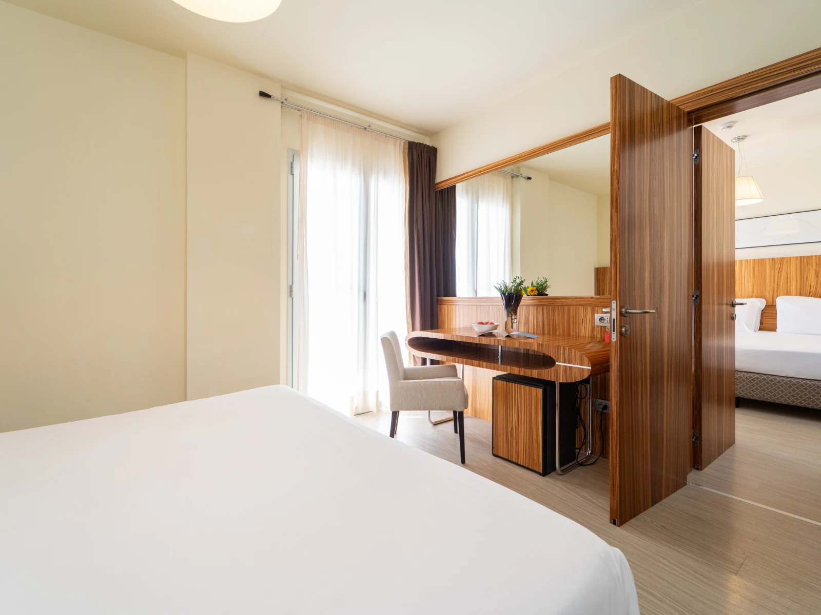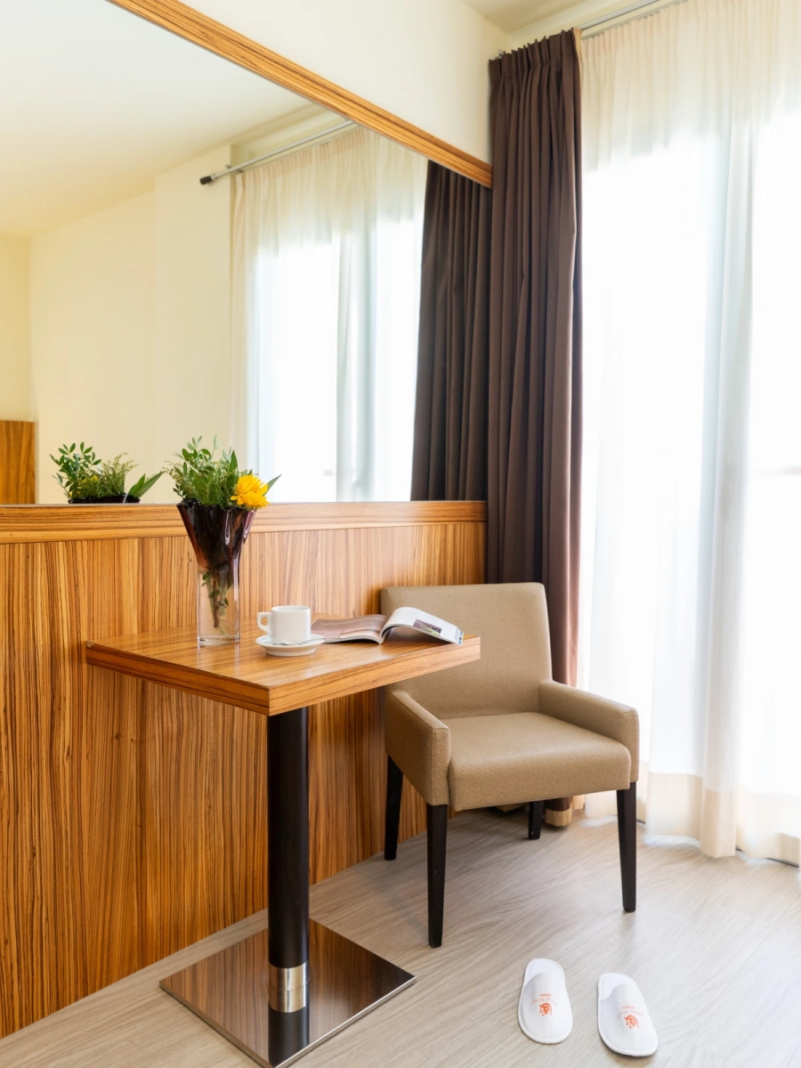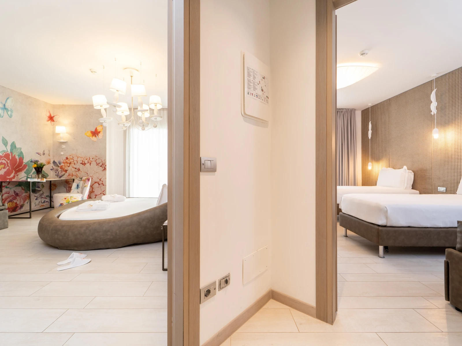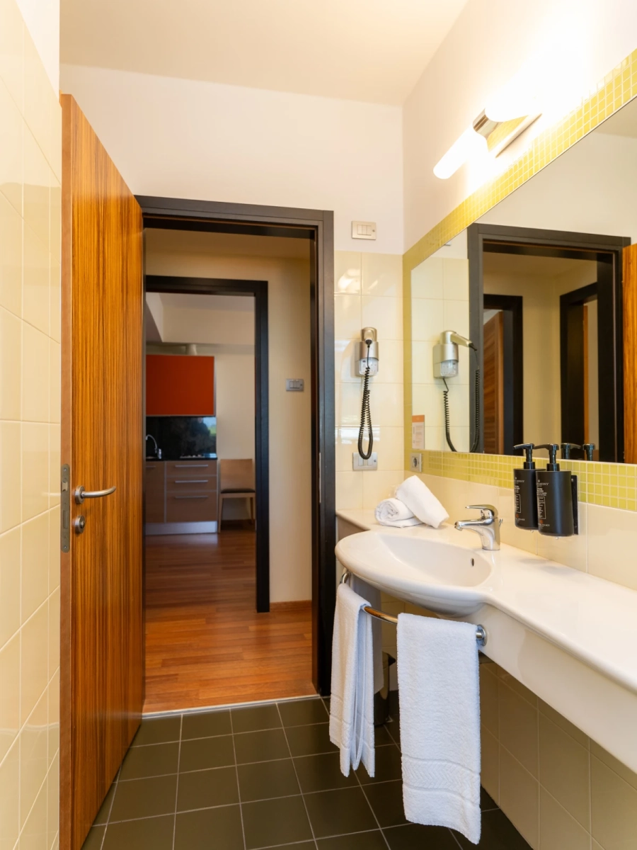 Easy SuiteDimensione:32 mq Persone:2/4 Struttura:2 ambienti separati con angolo cottura Un’accogliente e moderna Suite con terrazzo, caratterizzata da una camera matrimoniale con letto divisibile all’occorrenza, e da un soggiorno con comodo divano letto e angolo cottura, così puoi scaldare il latte e preparare le pappe per i tuoi piccoli. | Easy Suite |