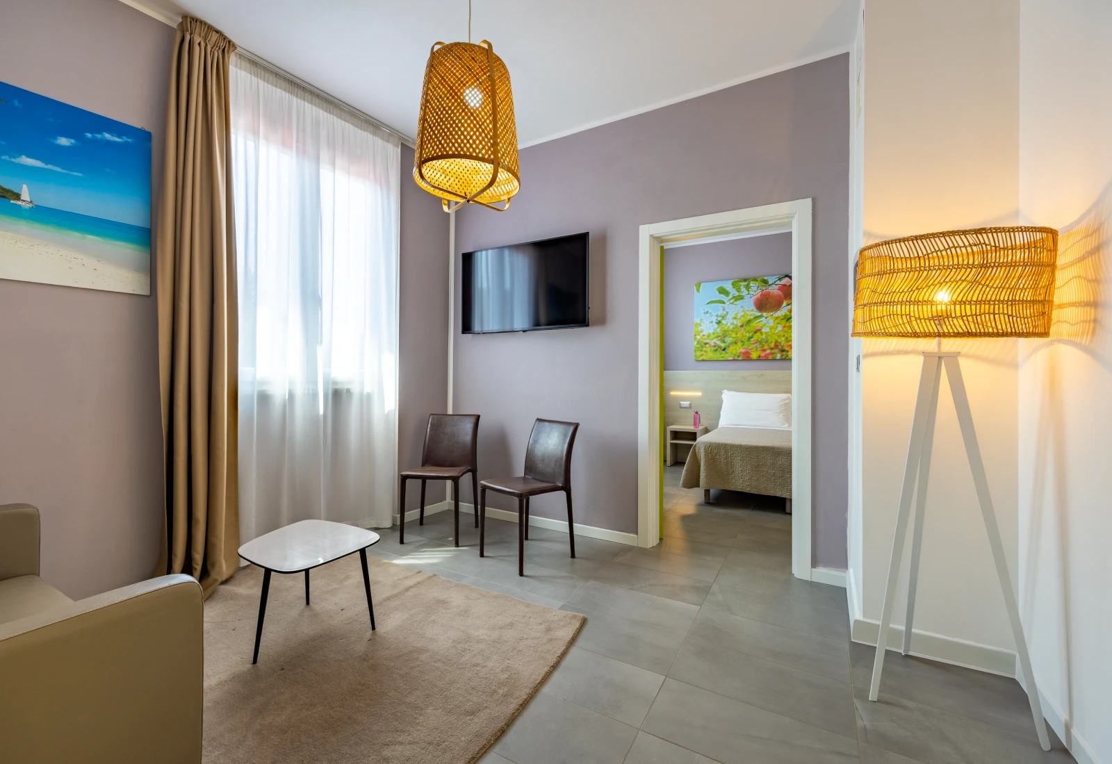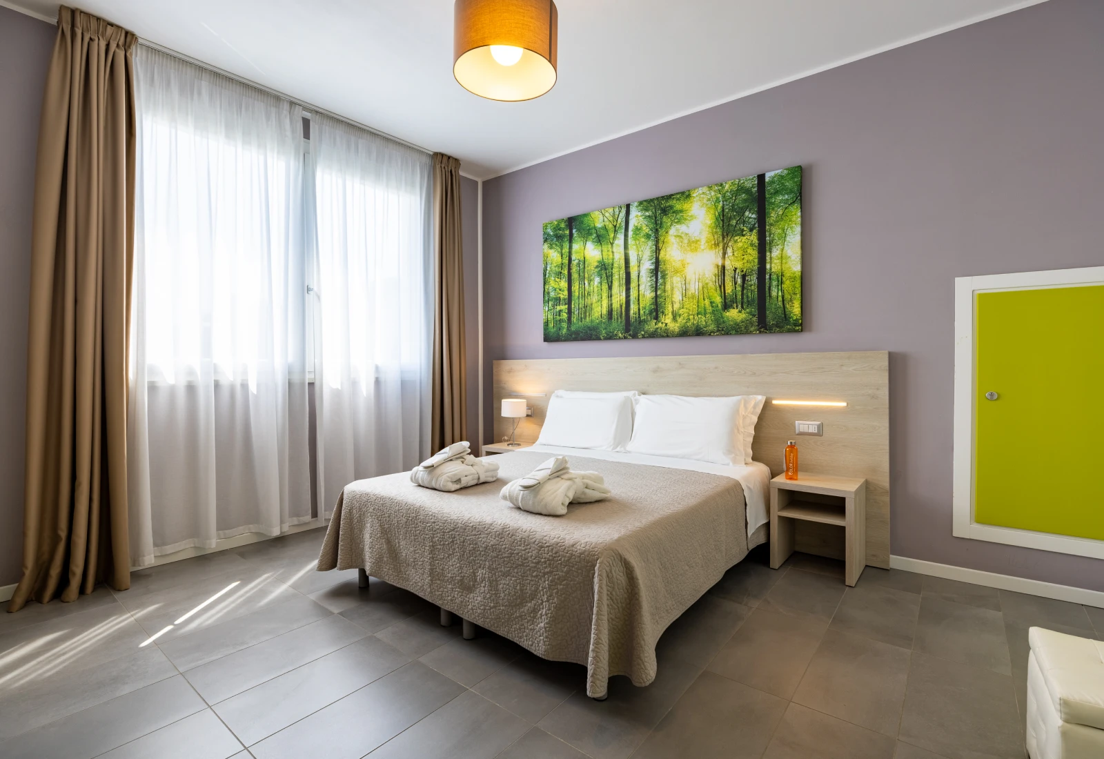Aria condizionataFree Wi-FiTVAsciugacapelliCassaforteMinifrigoDocciaSanificazione camereLetti con spondine, culle, scalda biberon, fasciatoiSmart | SmartDimensione:12-14 mq Camere ideali per chi viaggia in coppia oppure per i nonni in vacanza con la famiglia, offrono letto matrimoniale e letto a castello. |