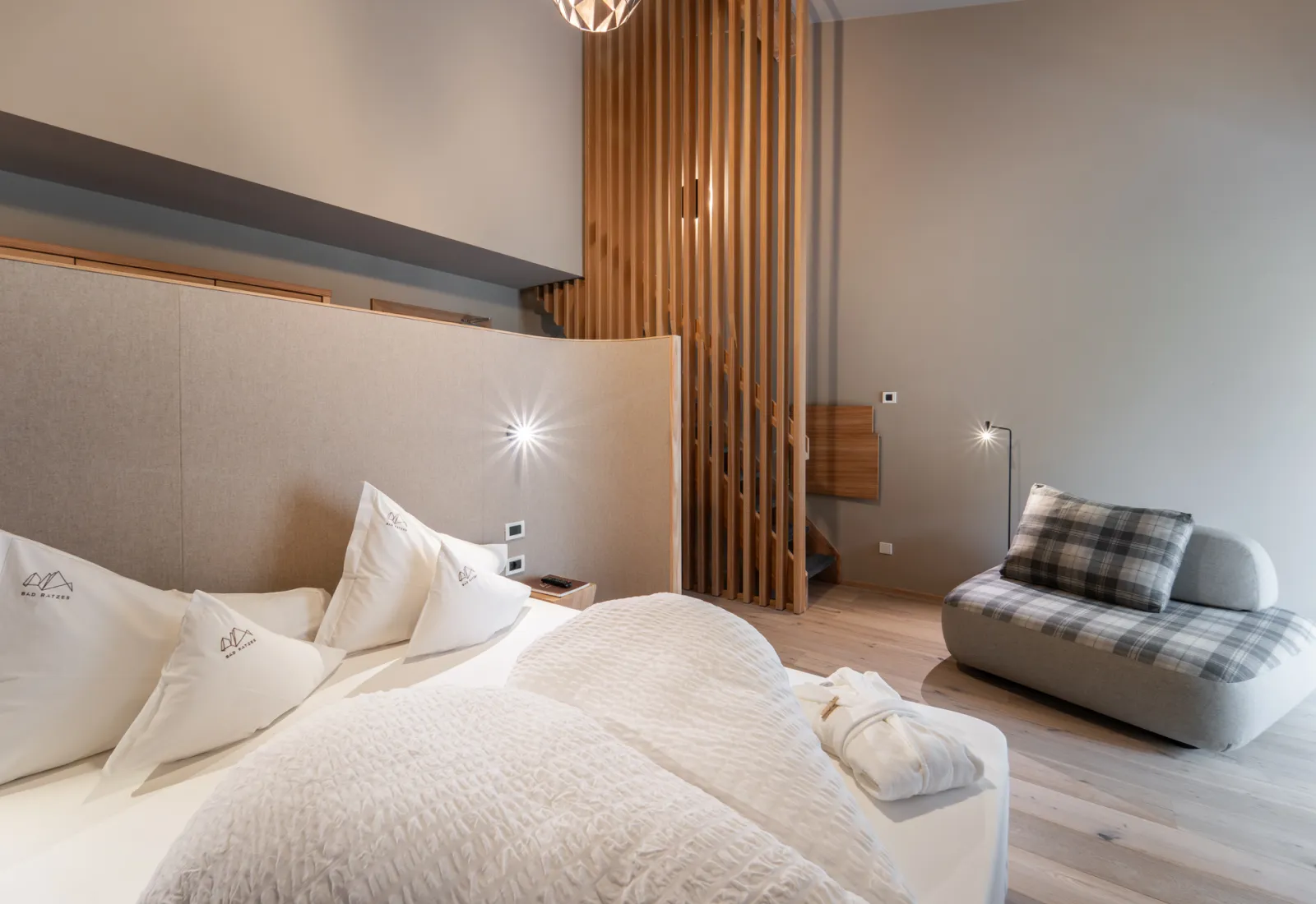 Suite familiale Bad RatzesStructure :Communicante Personnes :2 adultes + 2 enfants + 1 bébé Dimensions :42 m² Chambre de 42 m² avec balcon, conçue pour 2 adultes, 2 enfants et un bébé. Elle dispose d’une salle de bain avec table à langer et beaucoup d’espace pour les accessoires des plus petits et pour les moments de détente. | Suite familiale Bad Ratzes |