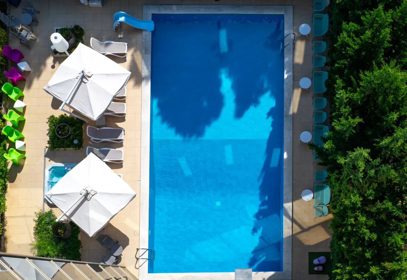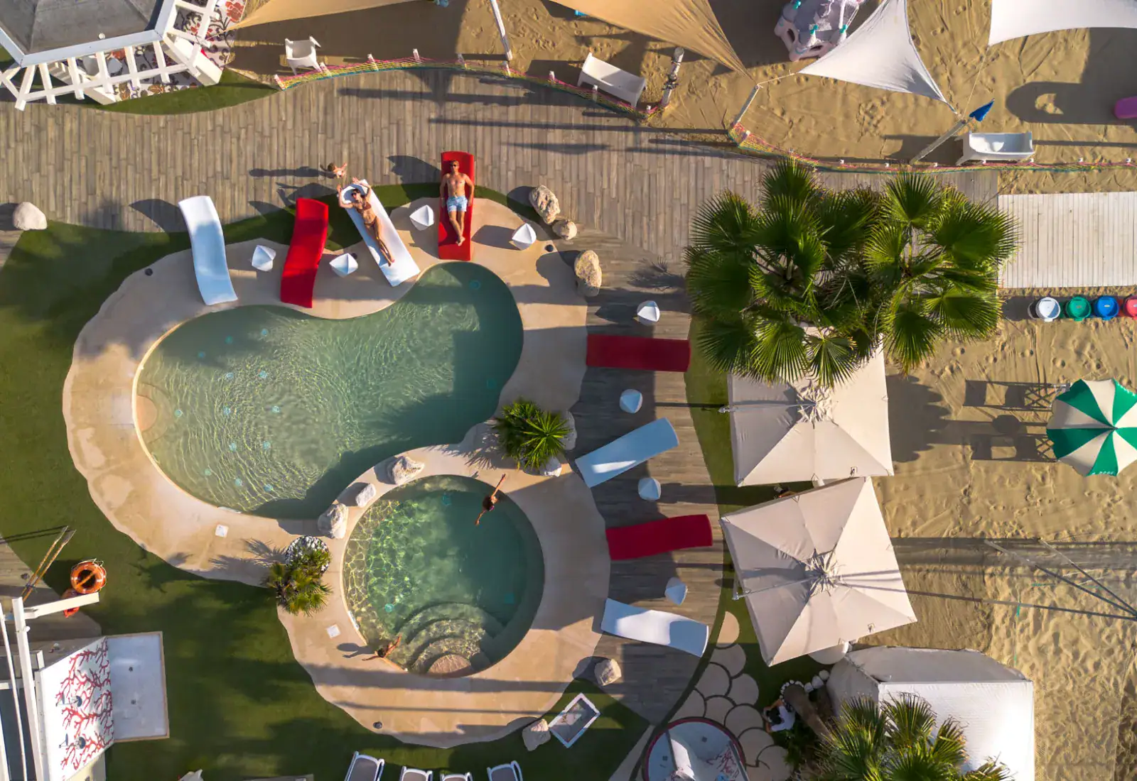 Nous nous soucions du bien-être de toute la famille, c’est pourquoi vous trouverez également, à l’hôtel, une piscine et des jacuzzis parmi les palmiers du jardin.