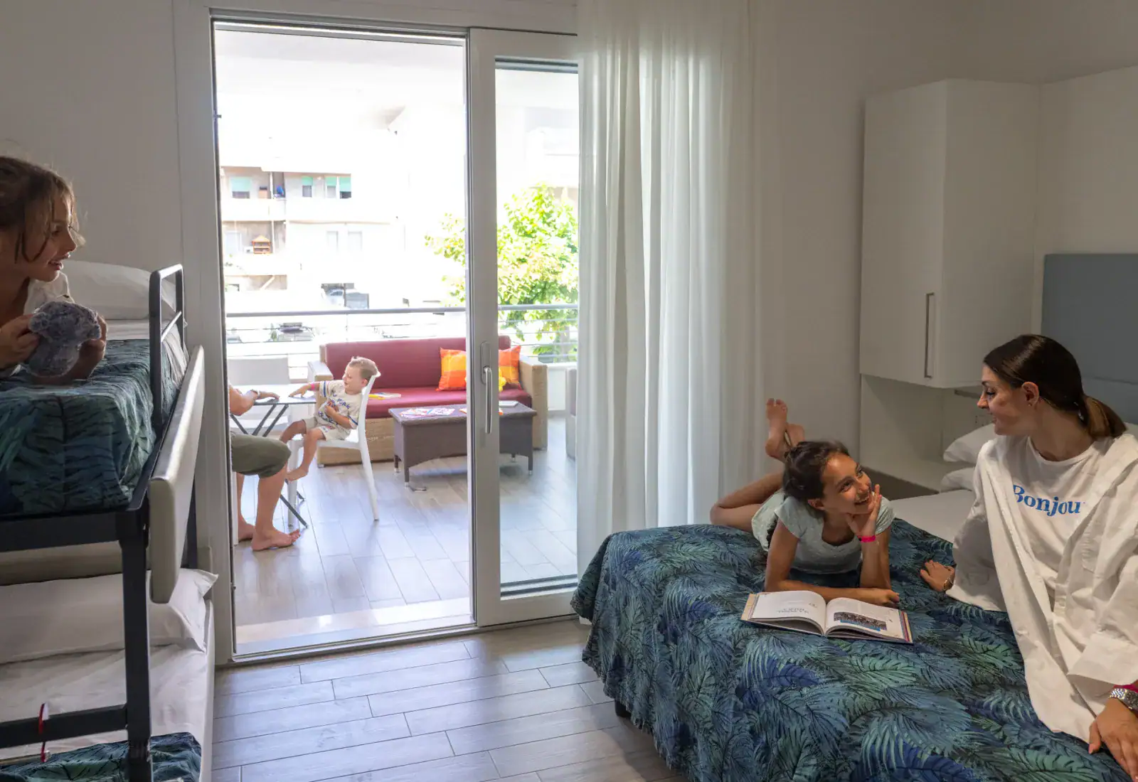 Chambre GirasoleDimensions :22 m² Personnes :de 3 à 5 Vue :Mer Chambre familiale de 22 m² au 6e étage : depuis le balcon, vous pourrez profiter d’une magnifique vue sur la mer ! Une porte coulissante sépare la chambre double, dans laquelle il est possible d’ajouter un lit simple, de la chambre où peuvent dormir deux enfants. La solution idéale pour l’hébergement de 3 à 5 personnes. | Chambre Girasole |