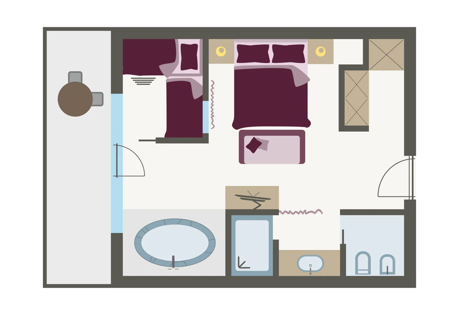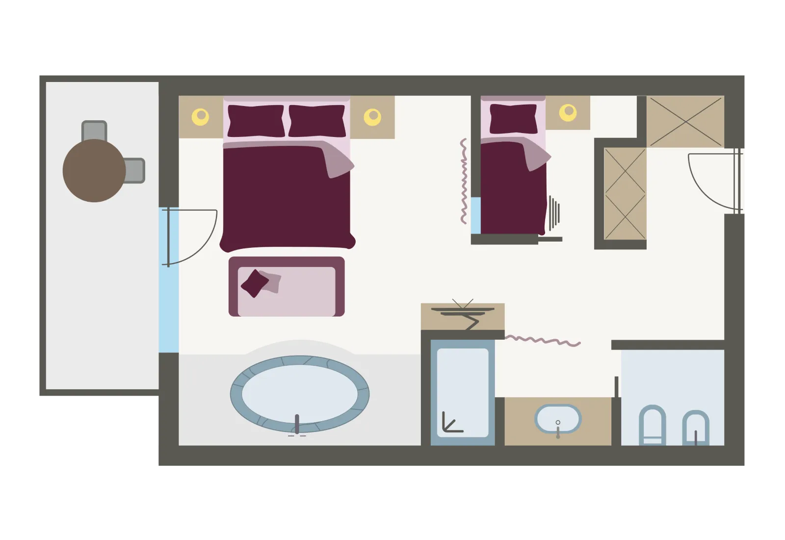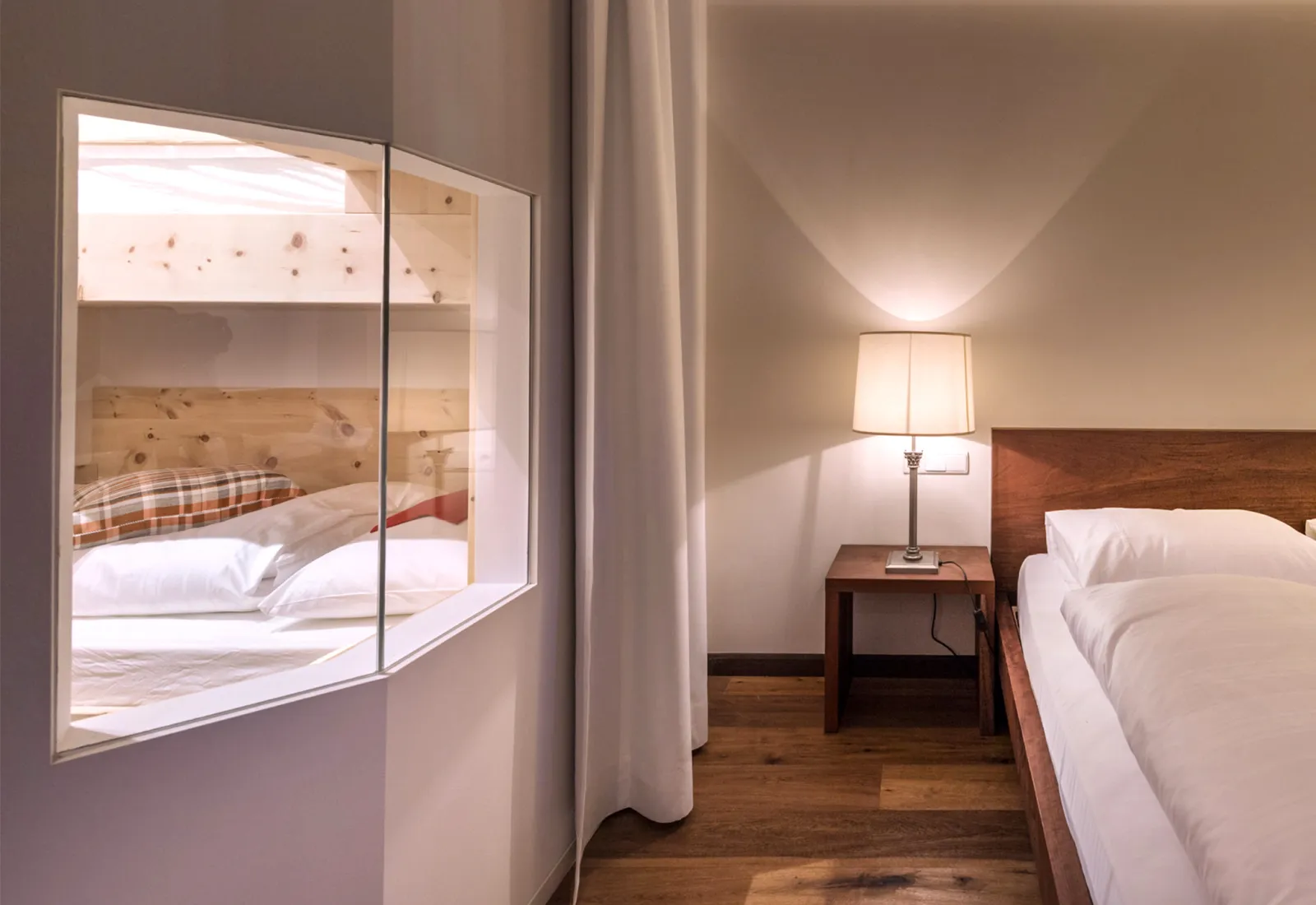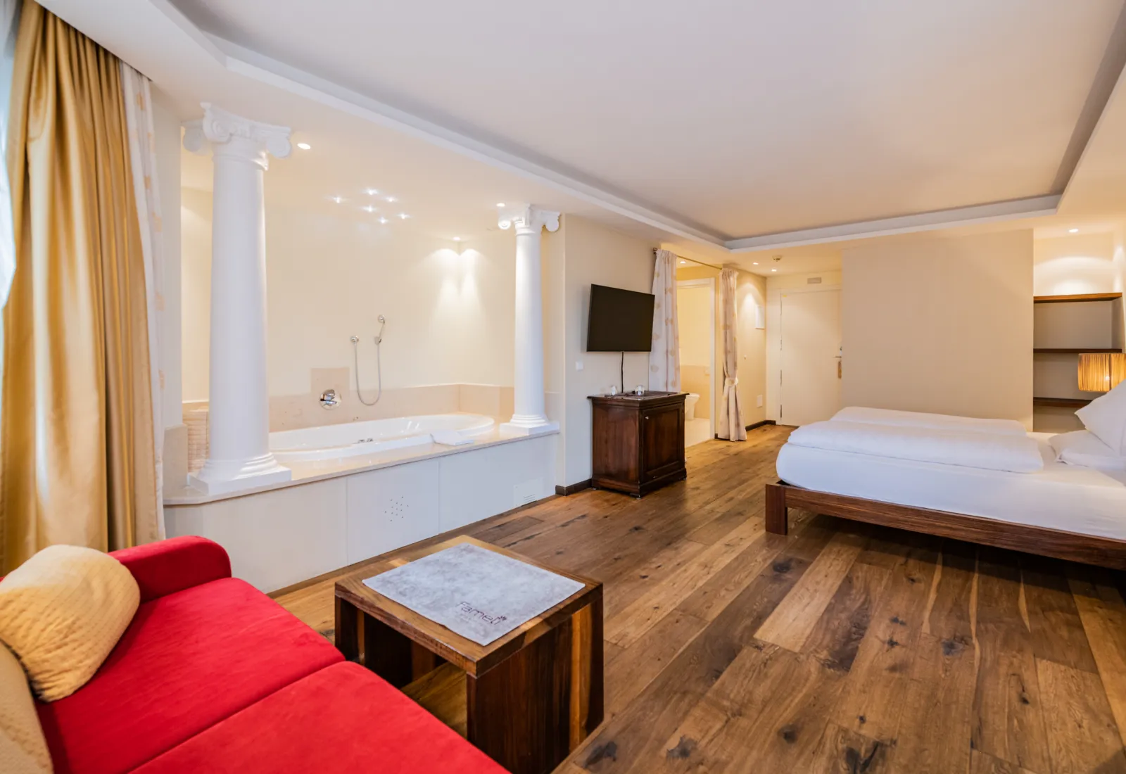 Suite Fameli DesignDimensions :46 m² Personnes :45048 Vue :Montagne Ces Suites de design ont des espaces confortables pour les familles avec deux enfants et un bébé. Il existe différentes solutions avec deux lits à deux places et Jacuzzi ; avec un lit à deux places, un lit superposé et le Jacuzzi ; avec lit à deux places et une petite chambre des enfants séparée, dotée de lit superposé, avec ou sans baignoire Jacuzzi. | Suite Fameli Design |
