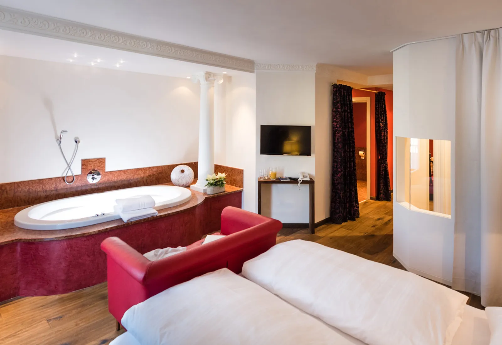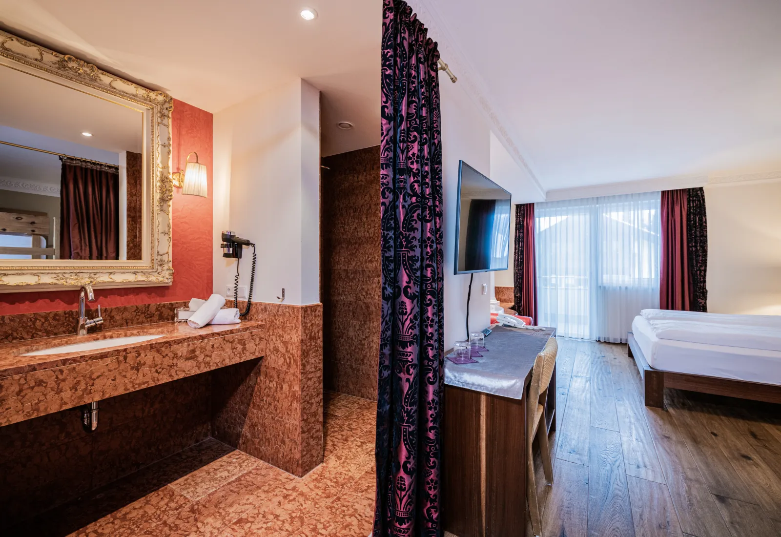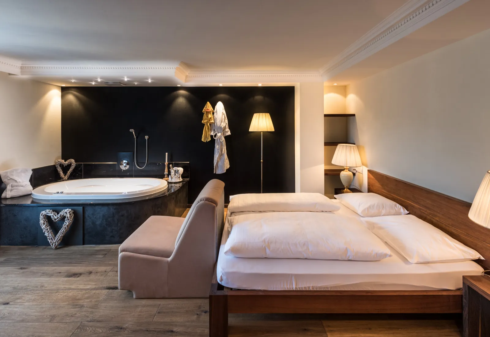 Suite Fameli DesignDimensions :46 m² Personnes :45048 Vue :Montagne Ces Suites de design ont des espaces confortables pour les familles avec deux enfants et un bébé. Il existe différentes solutions avec deux lits à deux places et Jacuzzi ; avec un lit à deux places, un lit superposé et le Jacuzzi ; avec lit à deux places et une petite chambre des enfants séparée, dotée de lit superposé, avec ou sans baignoire Jacuzzi. | Suite Fameli Design |