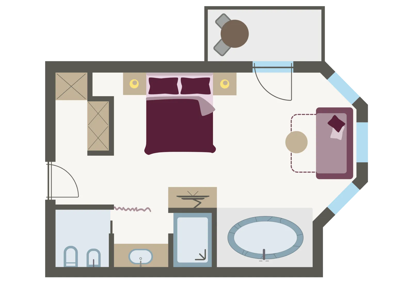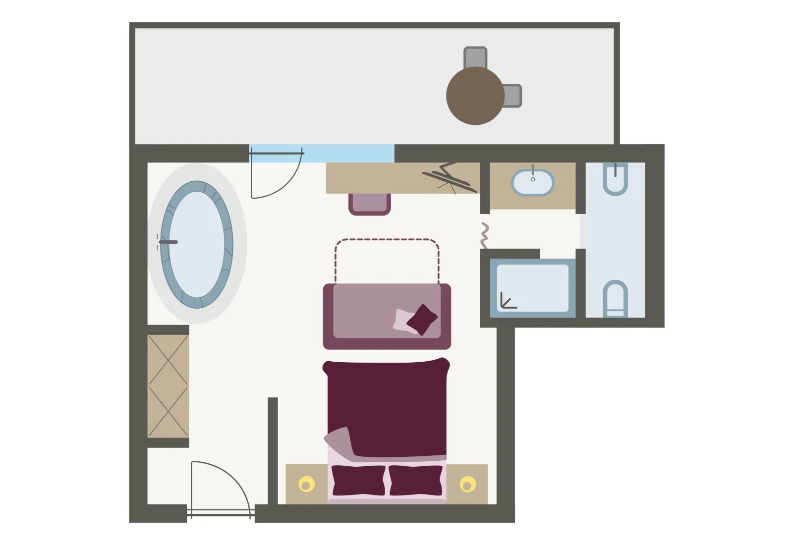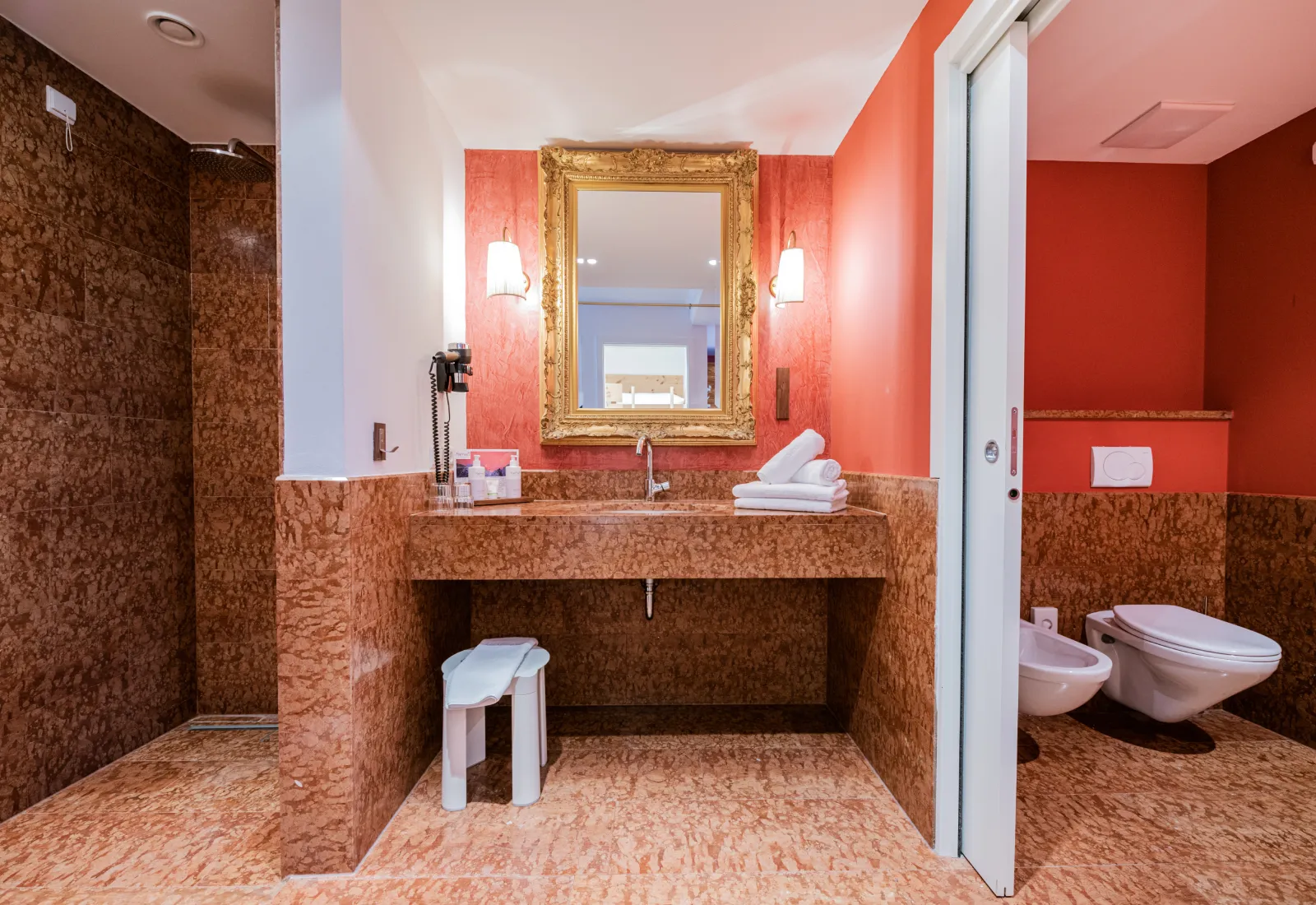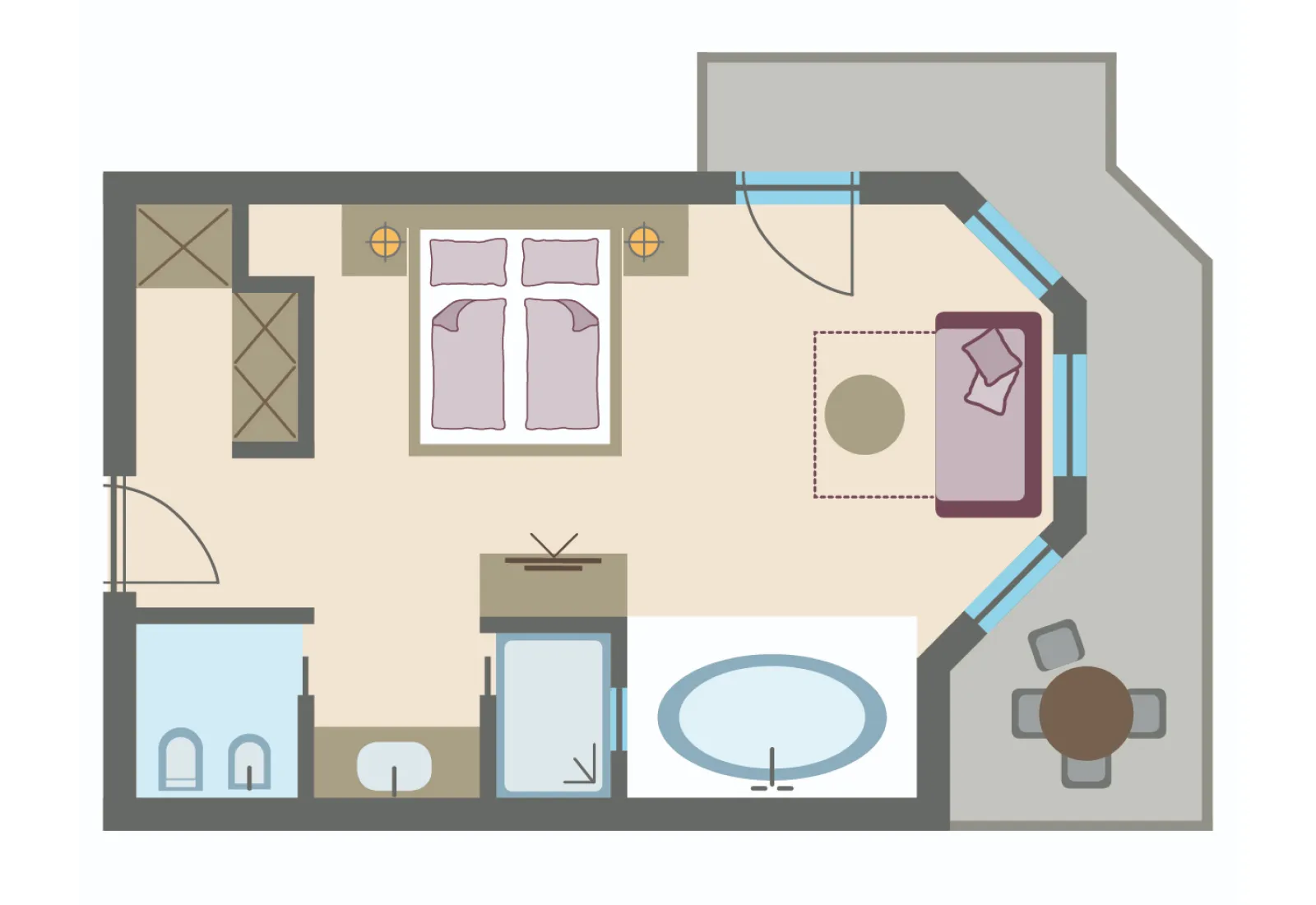Suite Fameli DesignDimensions :46 m² Personnes :45048 Vue :Montagne Ces Suites de design ont des espaces confortables pour les familles avec deux enfants et un bébé. Il existe différentes solutions avec deux lits à deux places et Jacuzzi ; avec un lit à deux places, un lit superposé et le Jacuzzi ; avec lit à deux places et une petite chambre des enfants séparée, dotée de lit superposé, avec ou sans baignoire Jacuzzi. | Suite Fameli Design |