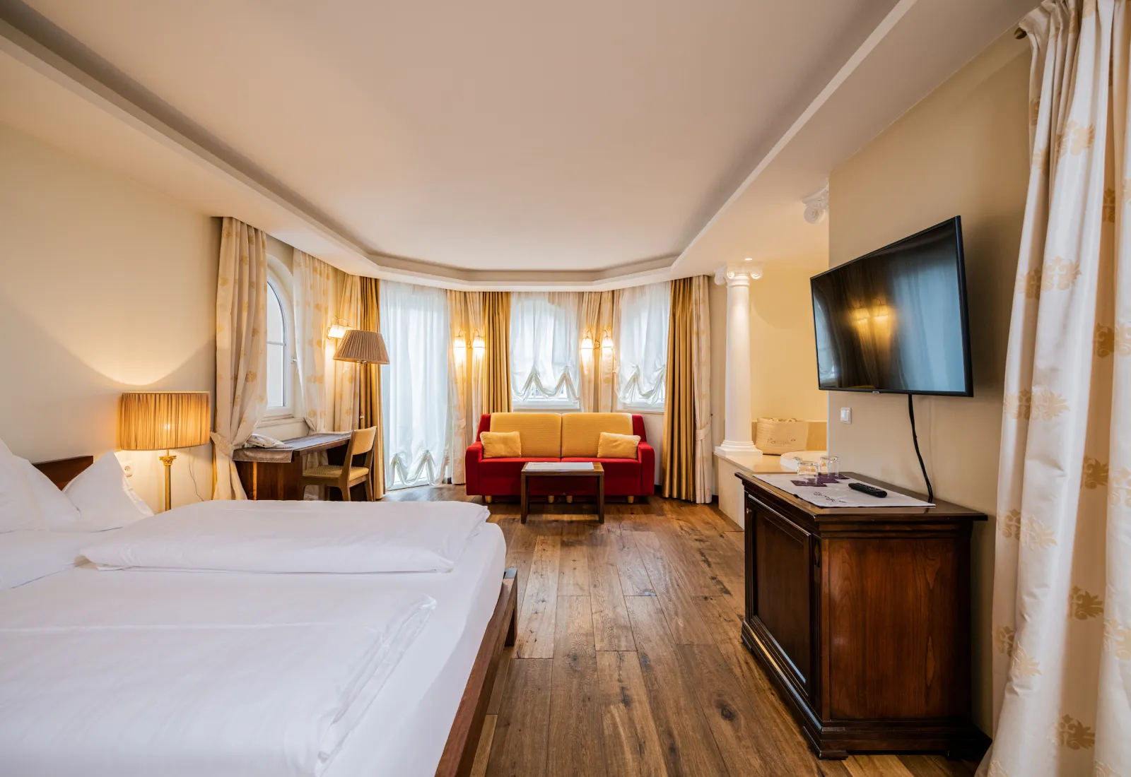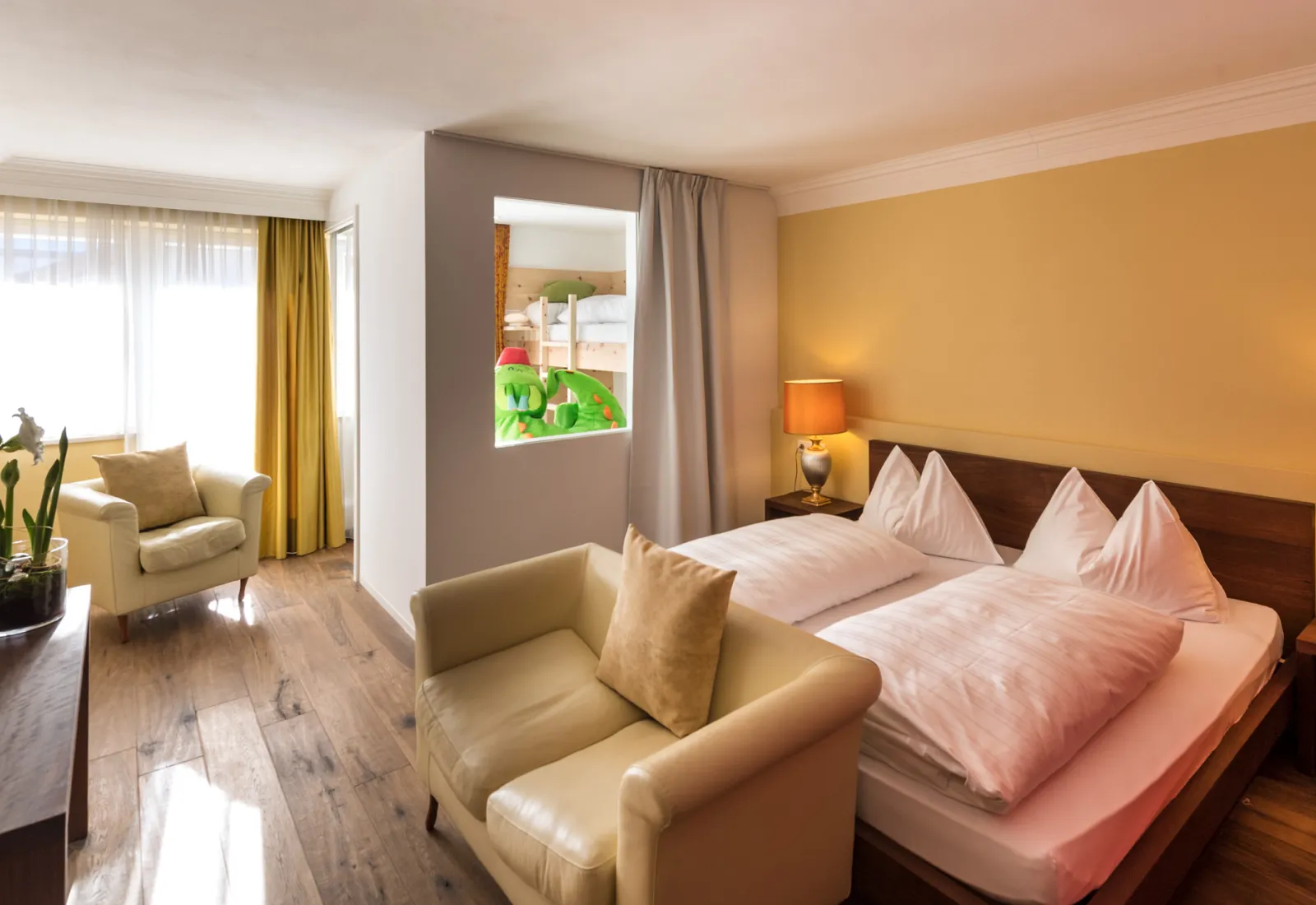 Wifi gratuitTVService de chambreChambres insonoriséesCoffre-fortMini-barBalconTerrasseDoucheAssainissement des chambresRéducteurs de toilettes et tabouretsLits avec barrières latérales, berceaux, chauffe-biberons, tables à langerSuite Fameli Superior | Suite Fameli SuperiorDimensions :38 m² Personnes :45018 Vue :Montagne Spacieuses, modernes, accueillantes, telles sont les principales caractéristiques des Suites Fameli Superior. Une solution parfaite même pour les grands-parents qui vont en vacances avec toute la famille et aiment les grandes chambres, ou bien pour la maman ou le papa avec ses enfants. Vous pouvez choisir entre deux solutions: avec un lit à deux places, deux canapés-lits et une baignoire hydromassage Jacuzzi; ou bien avec un lit à deux places, une petite chambre séparée pour les enfants avec un lit superposé. |