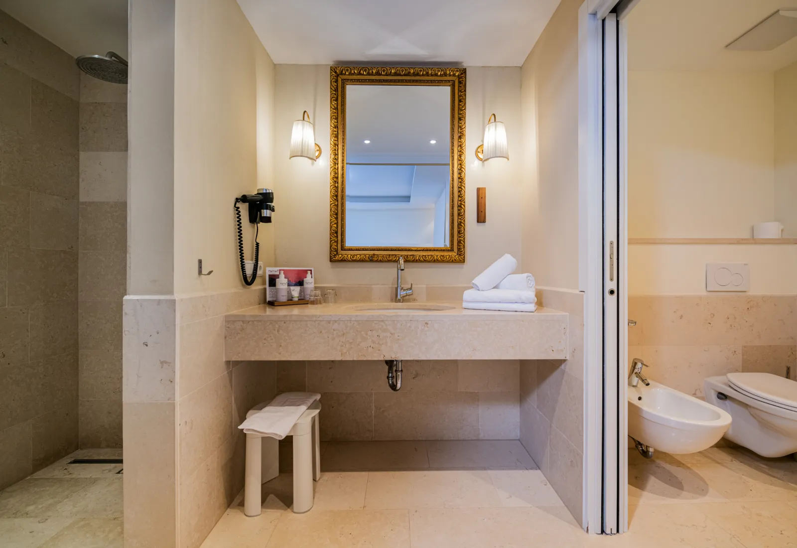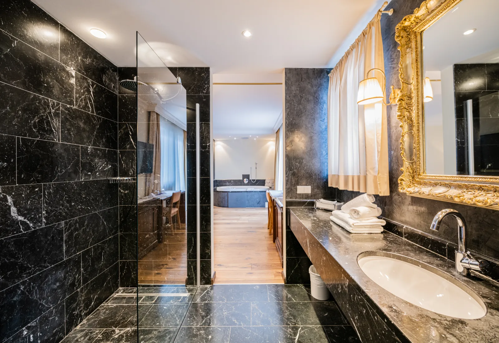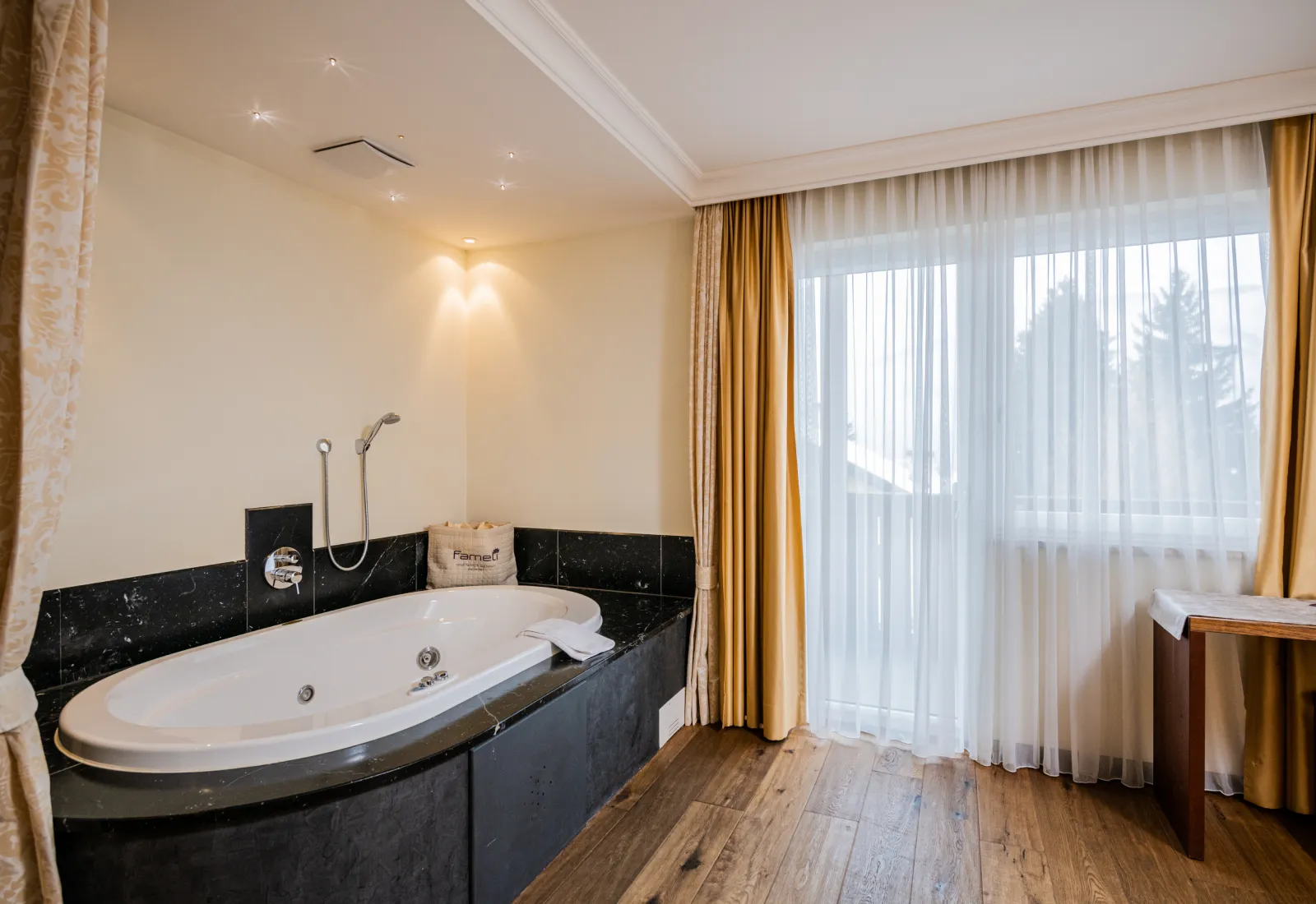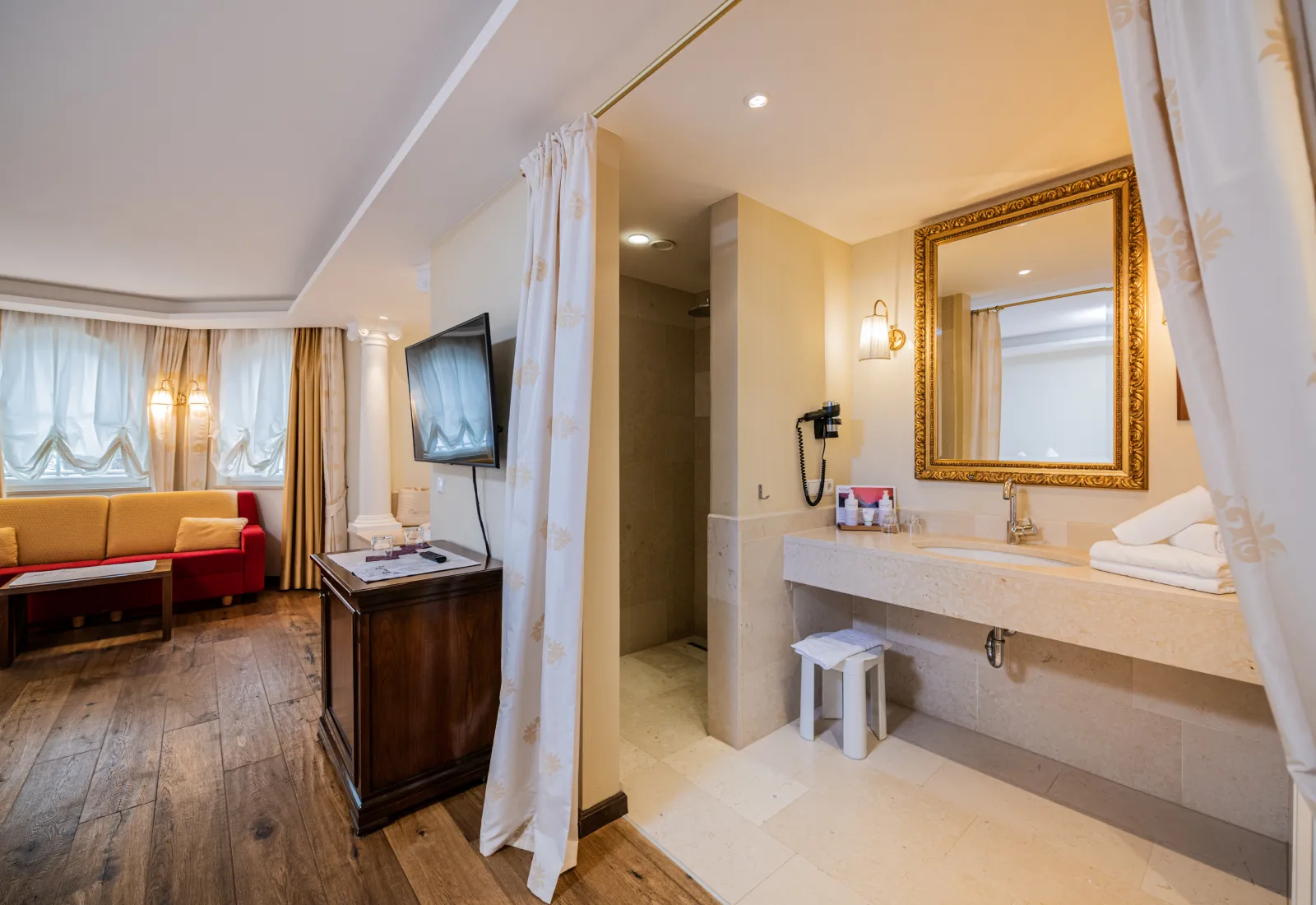Suite Fameli Castle | Suite Fameli CastleDimensions :55 m² Personnes :45018 Vue :Montagne Au 4e étage de l'hôtel, ces Suites sont la solution qui convient aux familles qui aiment les magnifiques panoramas de montagne. Spacieuses, élégantes et très tranquilles, dans les Suites Family Castle vous trouvez deux lits à deux places et la baignoire hydromassage Jacuzzi. |