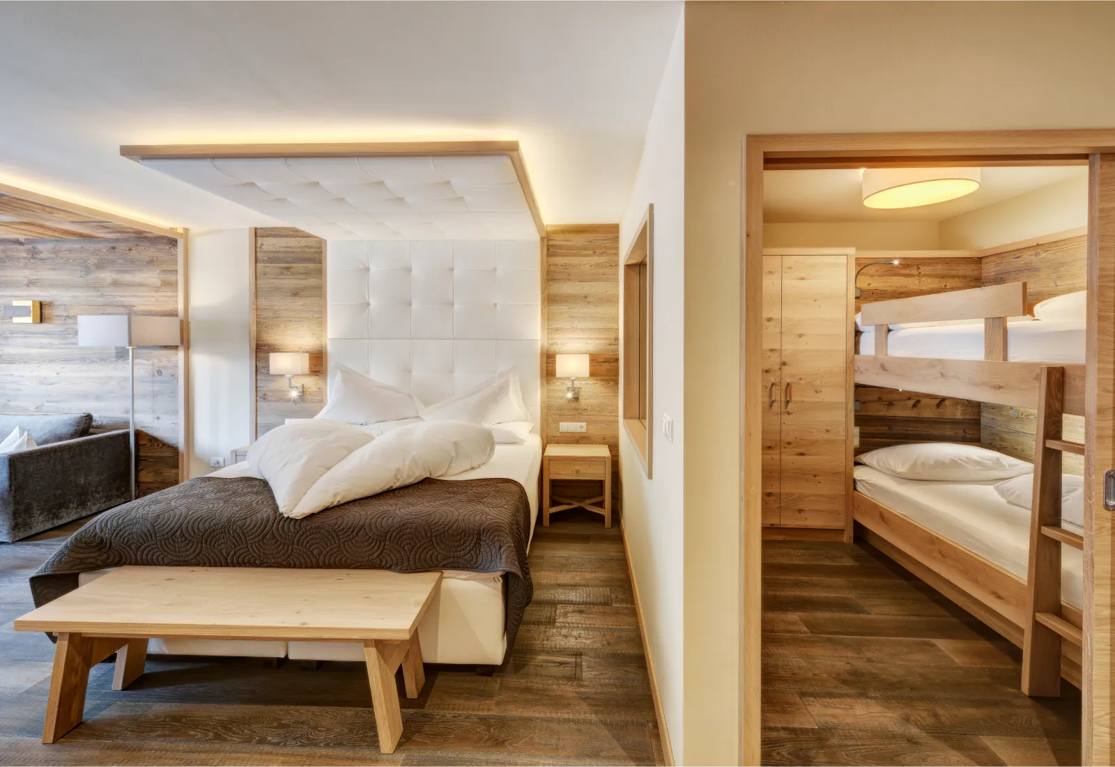 Chambre Double Ortler | Chambre Double OrtlerPersonnes :45749 Dimensions :50 m² Chambres doubles avec sols en bois et balcon, lit à deux places boxspring et coin living, couchette séparée avec lit superposé. La place de stationnement, dans le garage souterrain sous les courts de tennis, est incluse. |
